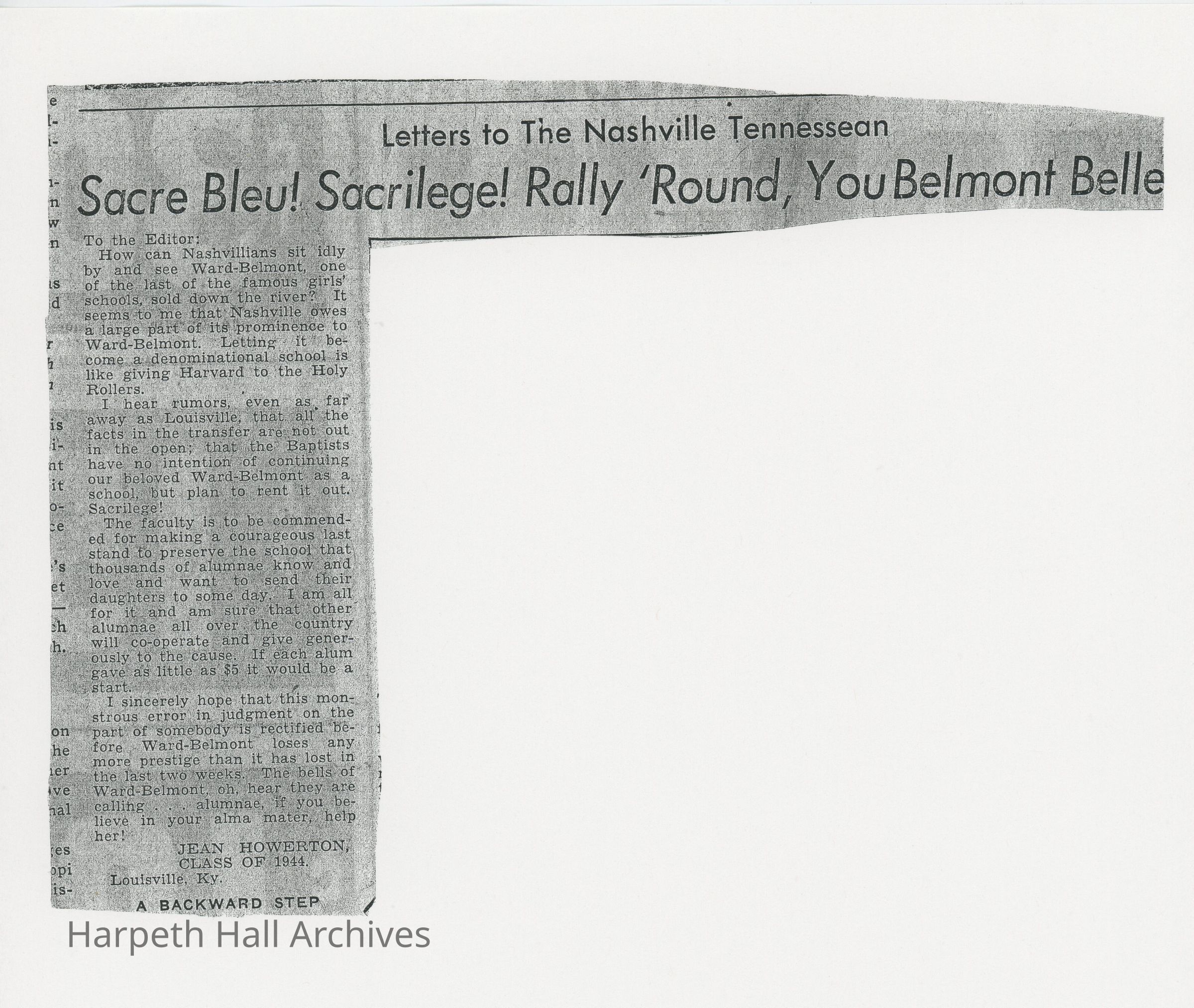 Article in the Nashville Tennessean from Jean Howerton '44 with speculations about the transfer of ownership to the Tennessee Baptist Convention.Collection