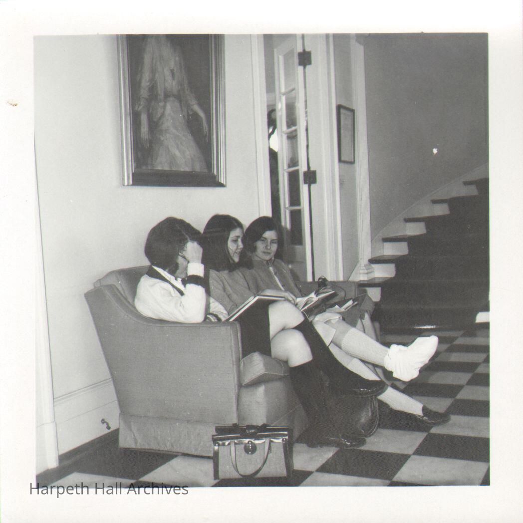 Three students sitting on sofa studying in the Souby Hall lobby in the 1960's.