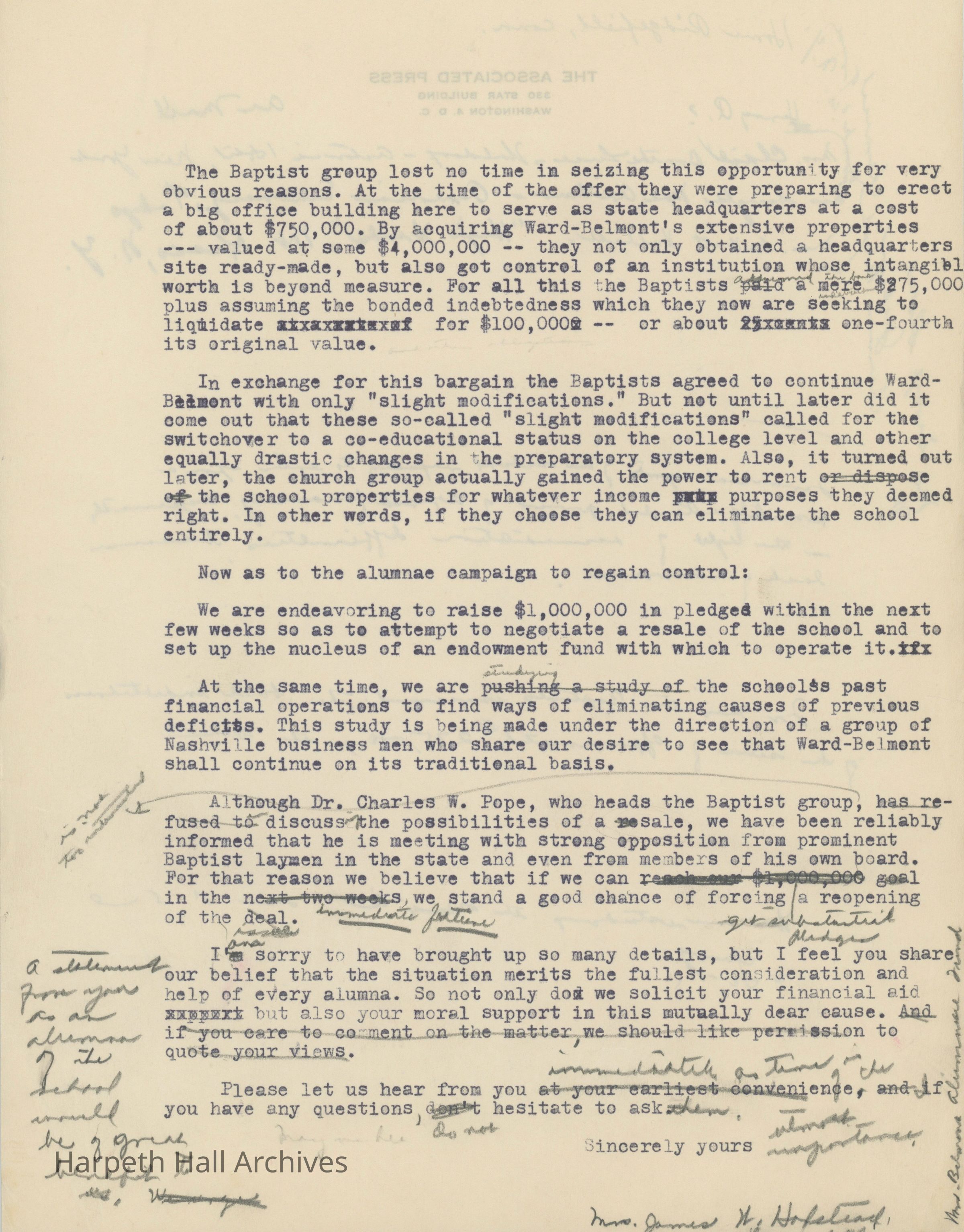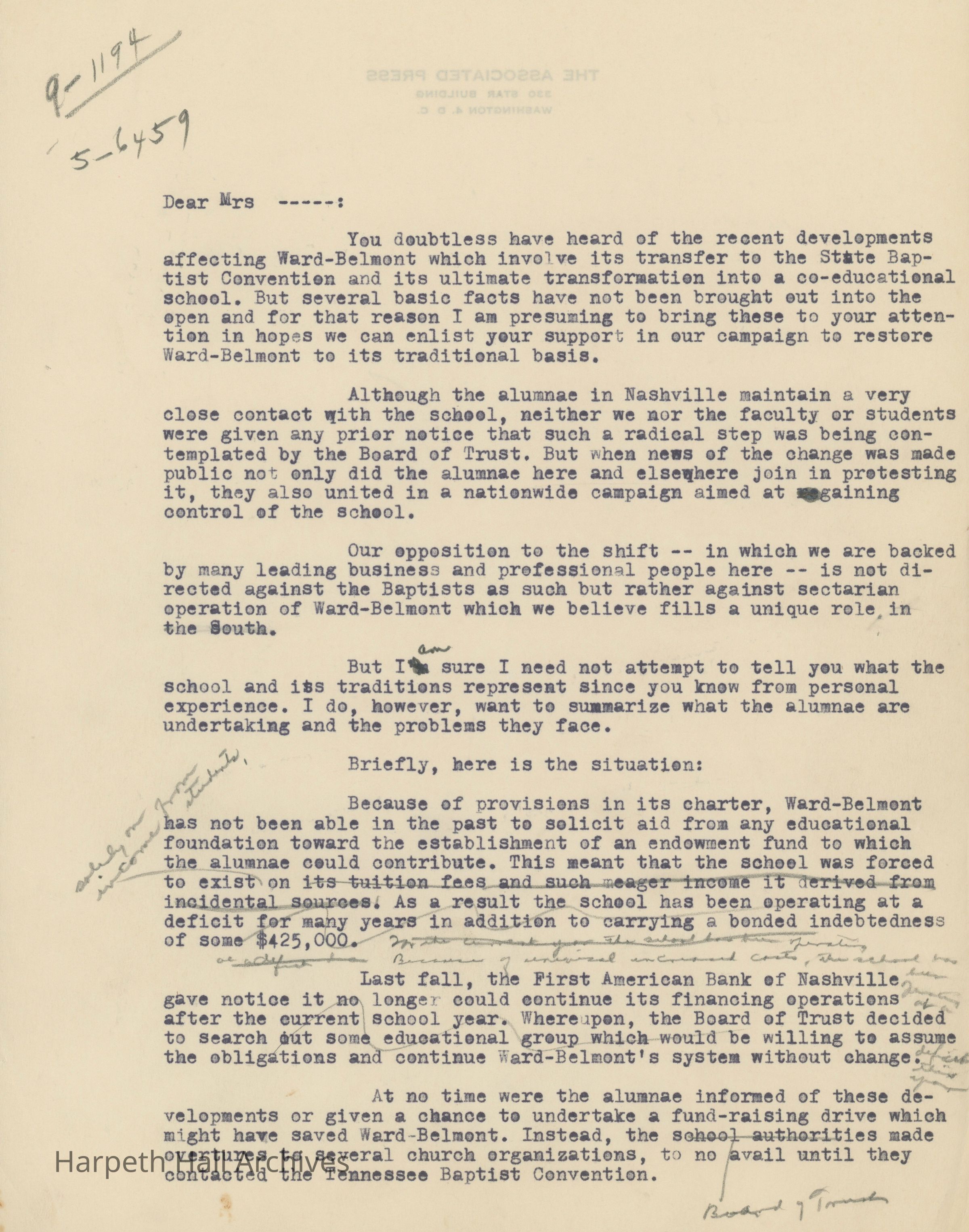 Draft of a letter to alumni briefly explaining the situation regarding the sale of Ward-Belmont to the Tennessee Baptist Convention.