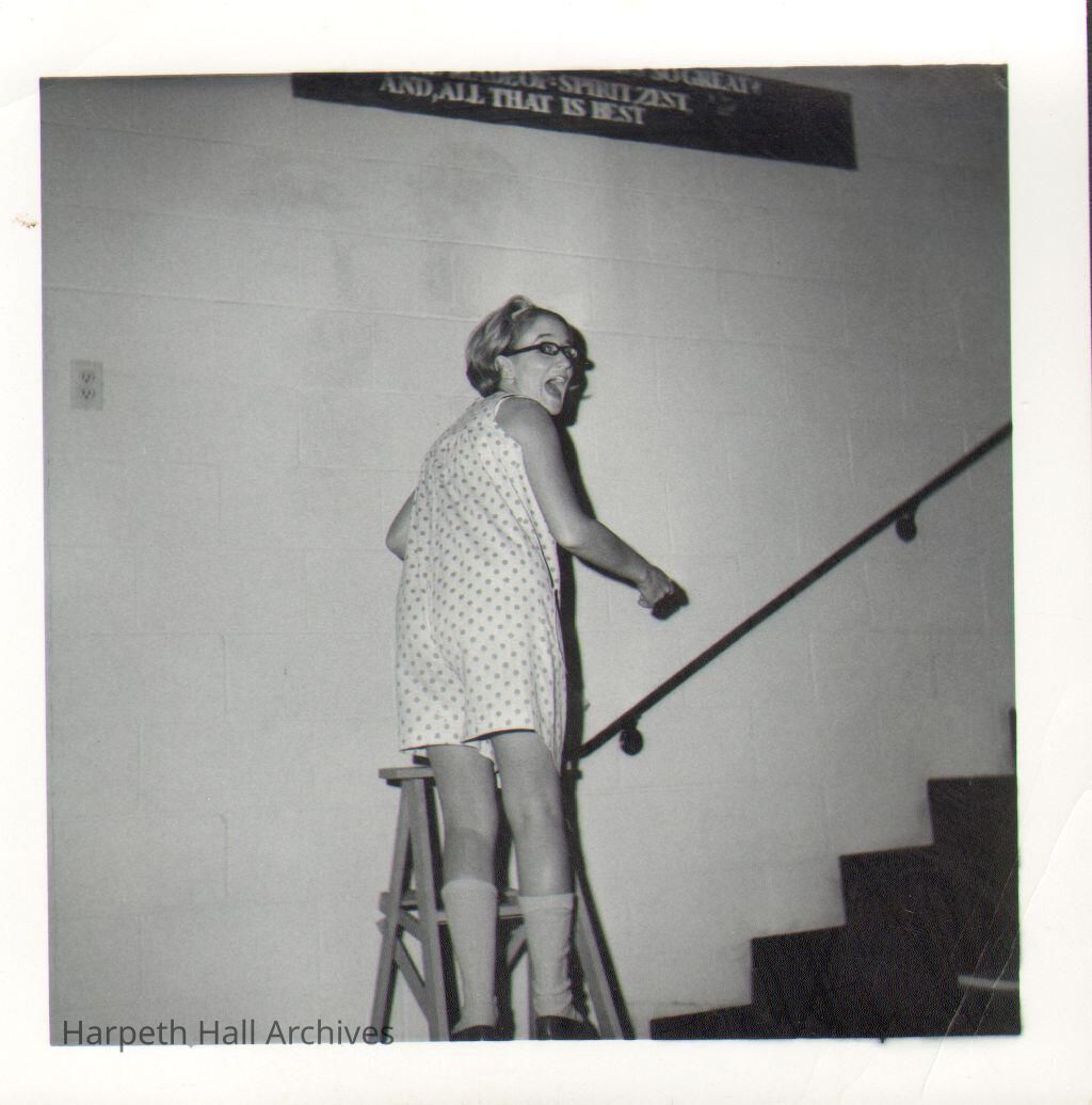 A student on a ladder by the stairs in the 1960's.