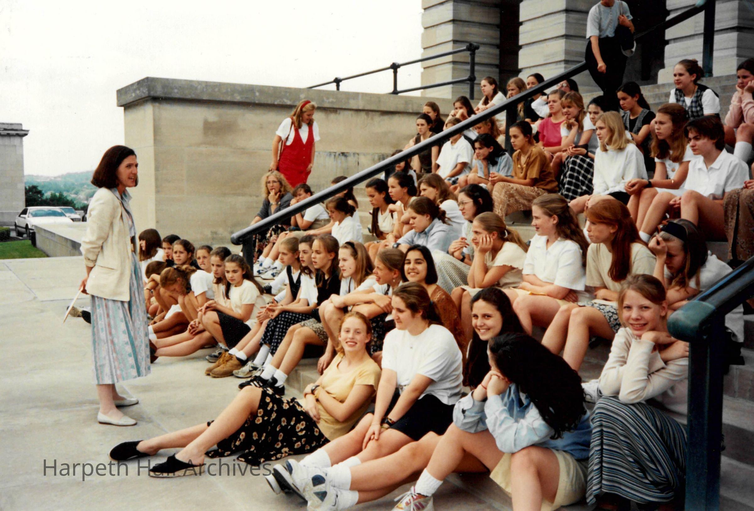 Class of 2000 sitting on steps during a field trip in the 1990s.