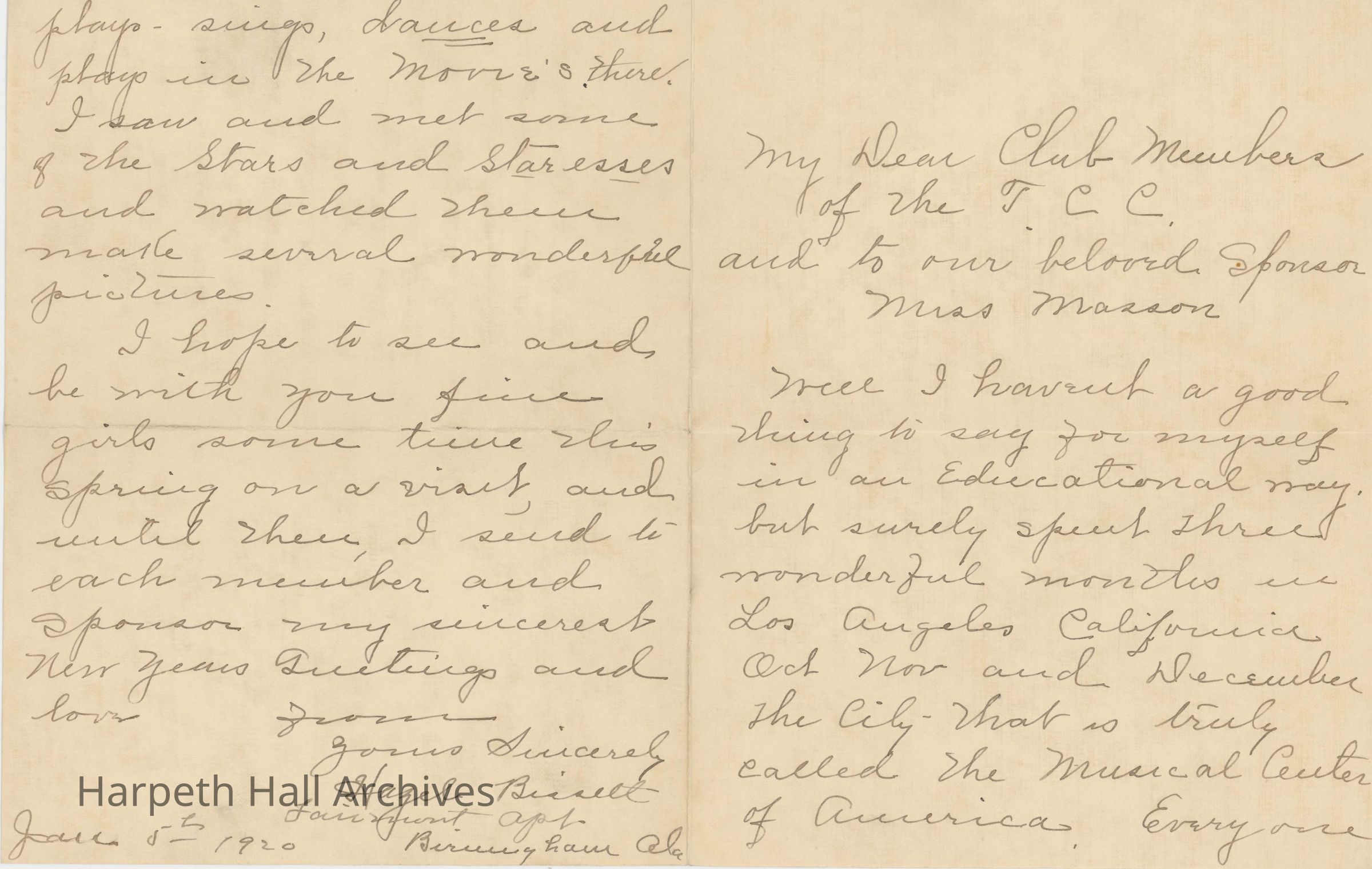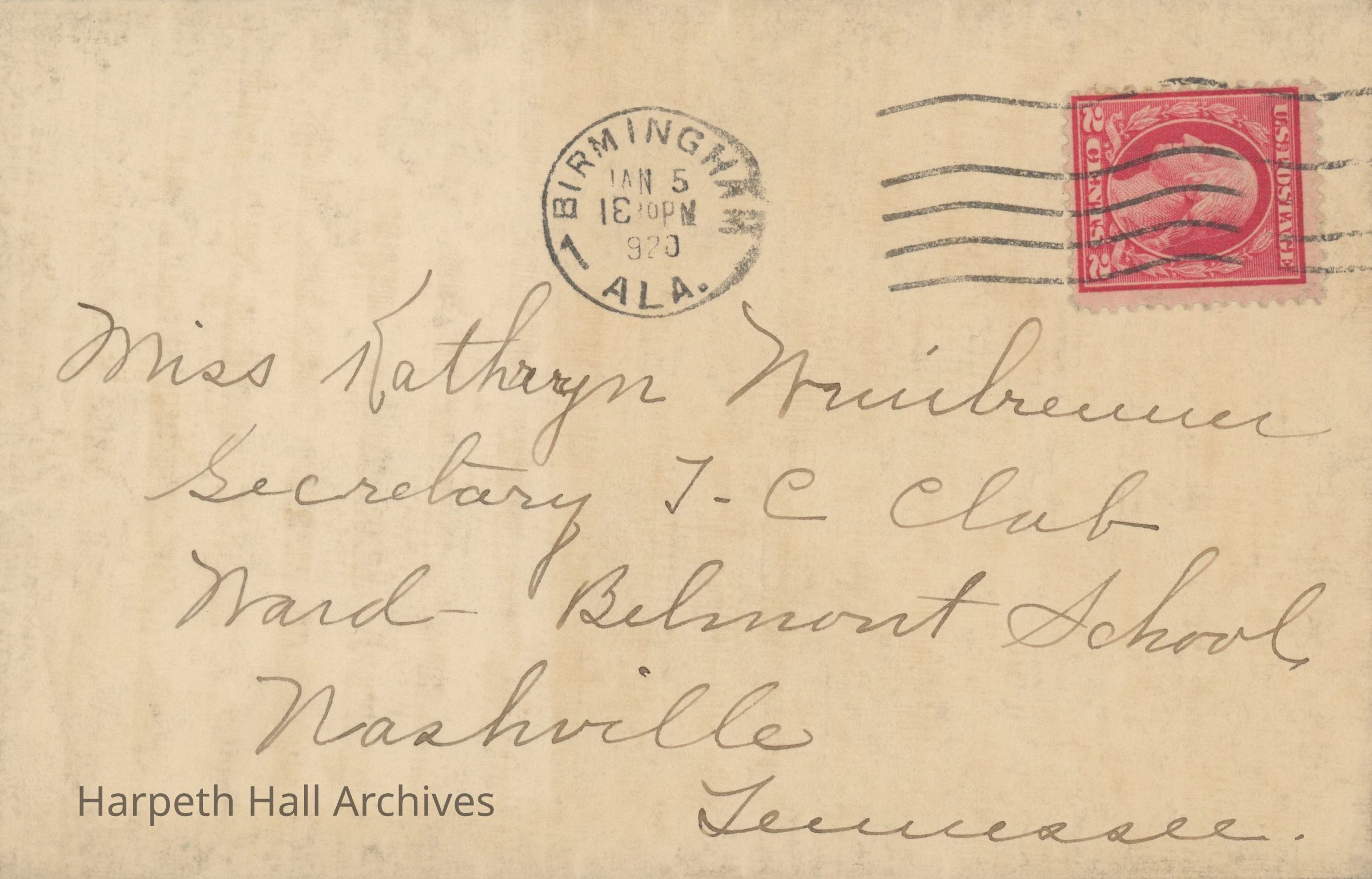 A letter written by former Ward-Belmont student Hazel Bissett in Birmingham, Alabama on January 5, 1920. Addressed to Kathryn Weinbrenner, secretary of the Twentieth Century Club in 1920.Context