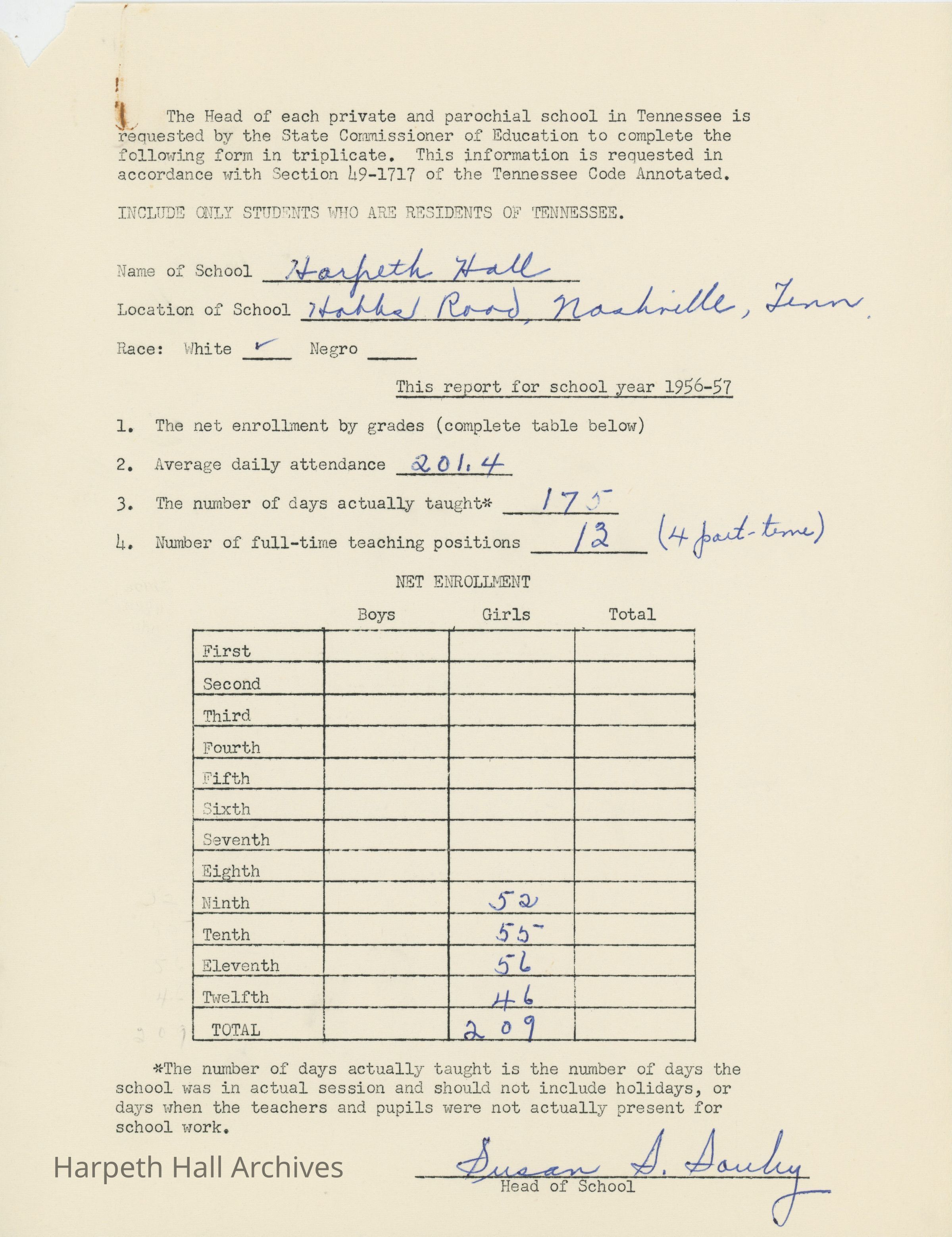 Report of Harpeth Hall's student attendance, as well as the number of instructional days and teaching positions for the 1956-57 school year.Collection