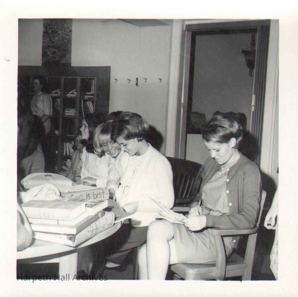 Beth Thomason, Leigh Zerfoss, Ann McKee inside with books in 1960's.