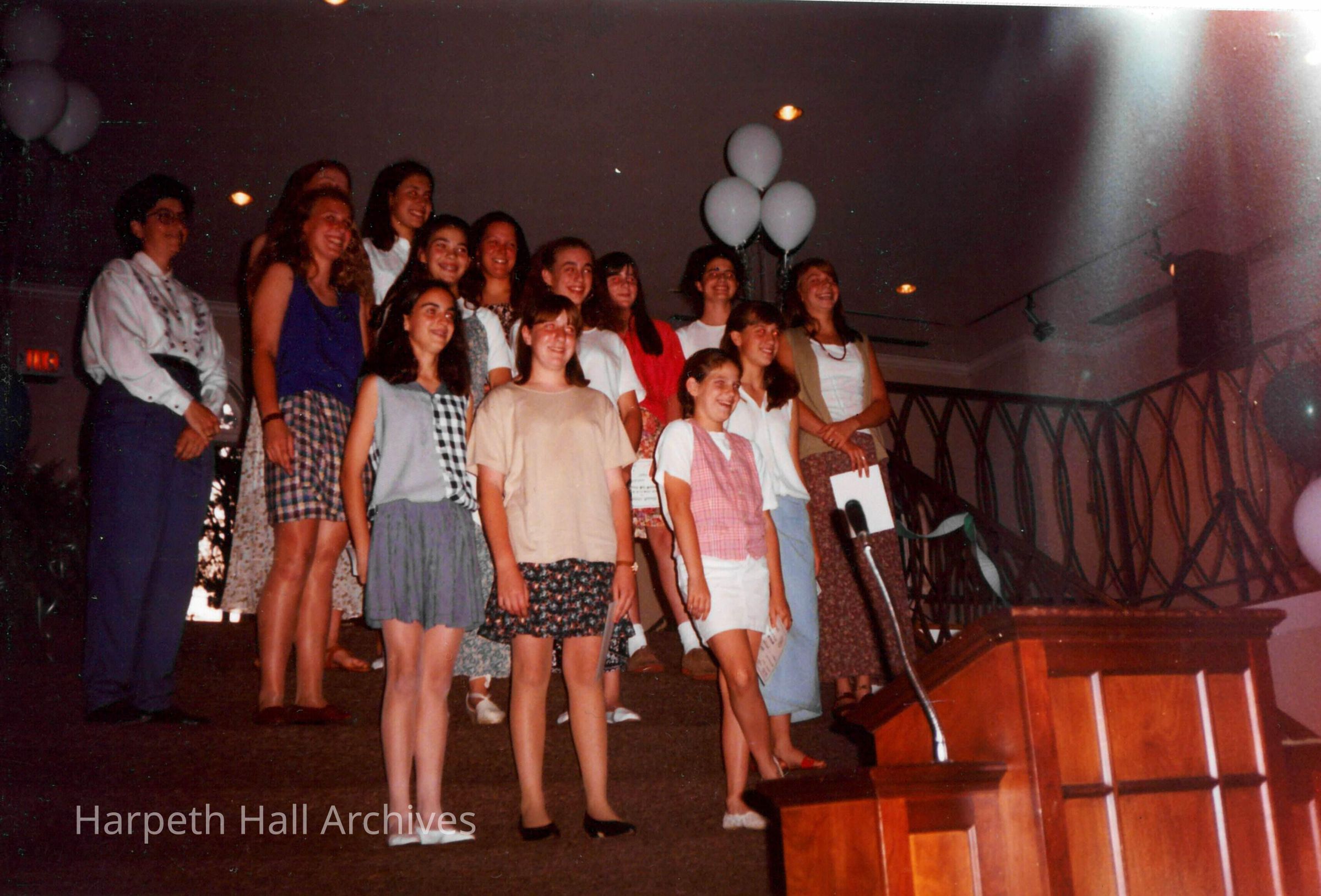 A group of students standing on the steps in the Marnie Sheridan Gallery in the McMurry Center. Appears to be some sort of award ceremony.