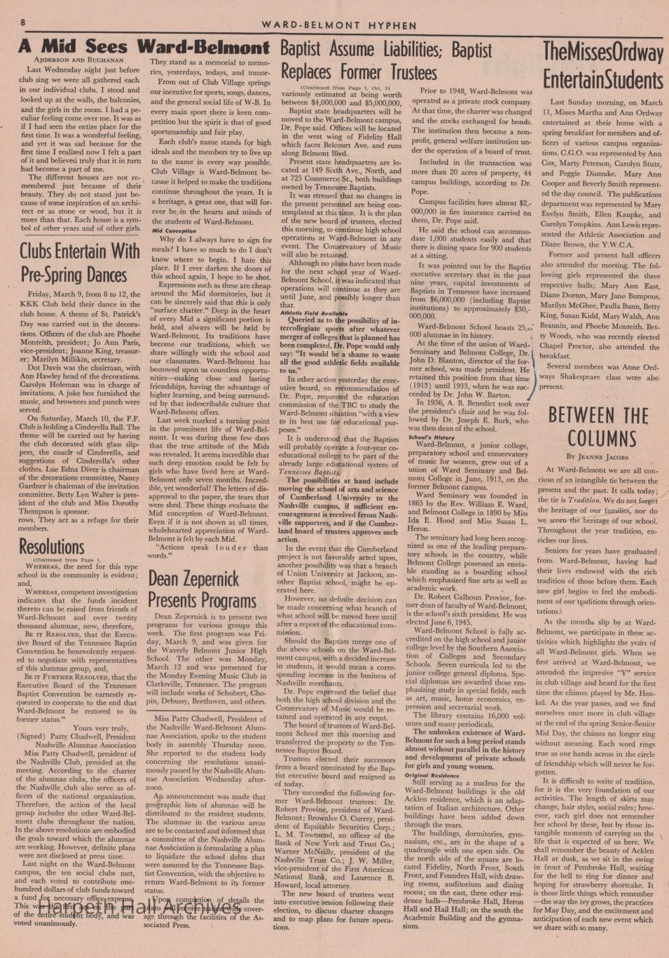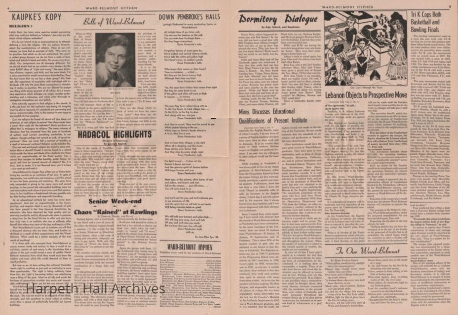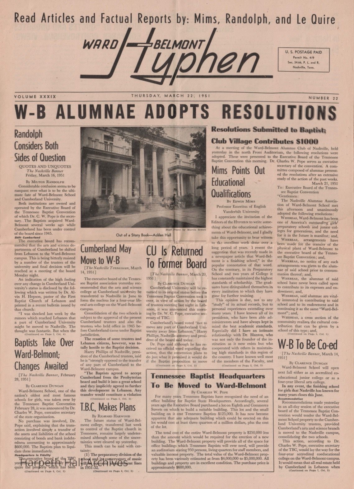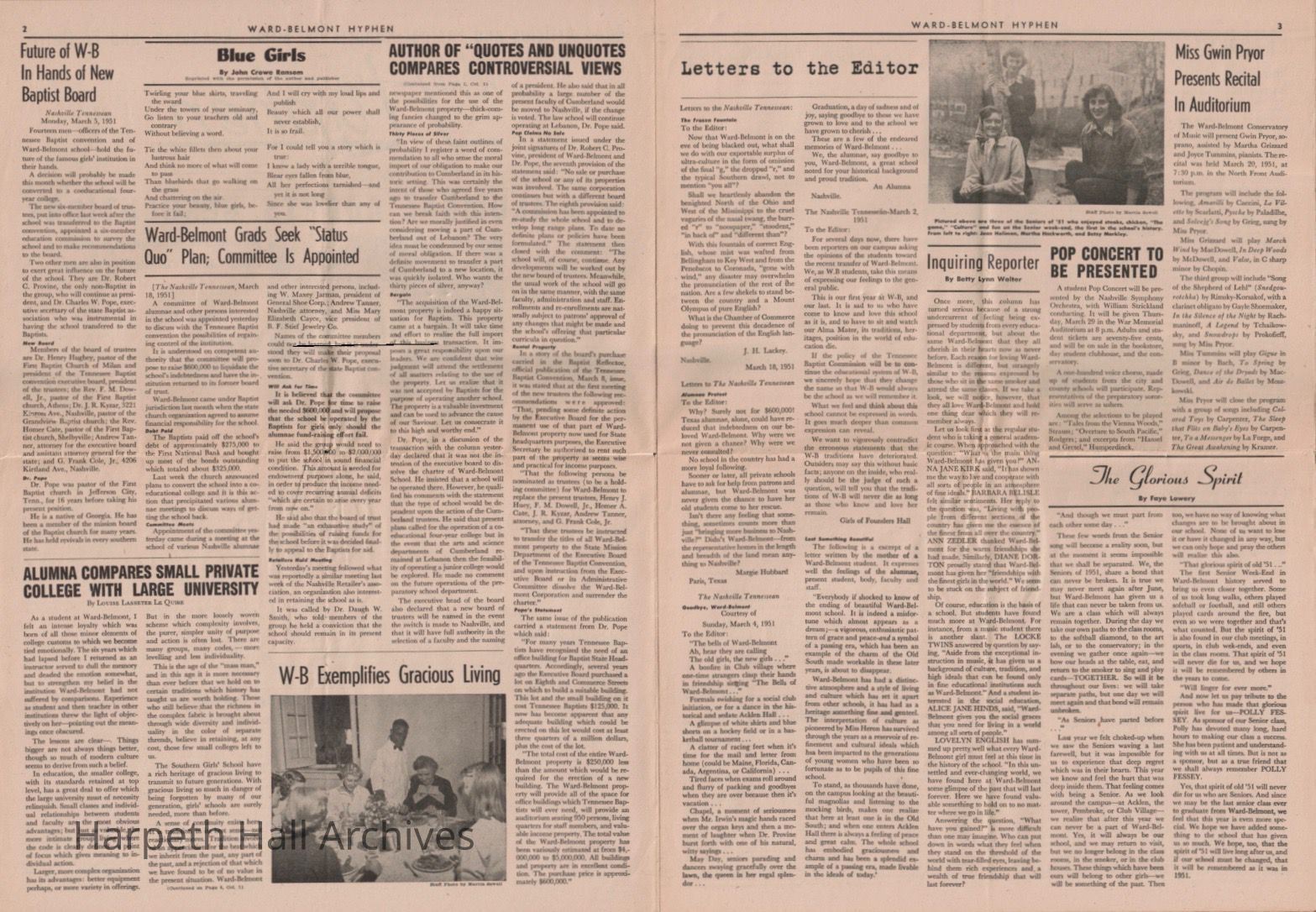 Ward-Belmont Hyphen newspaper on updates on Ward-Belmont's school status and student activities. March 22, 1951.