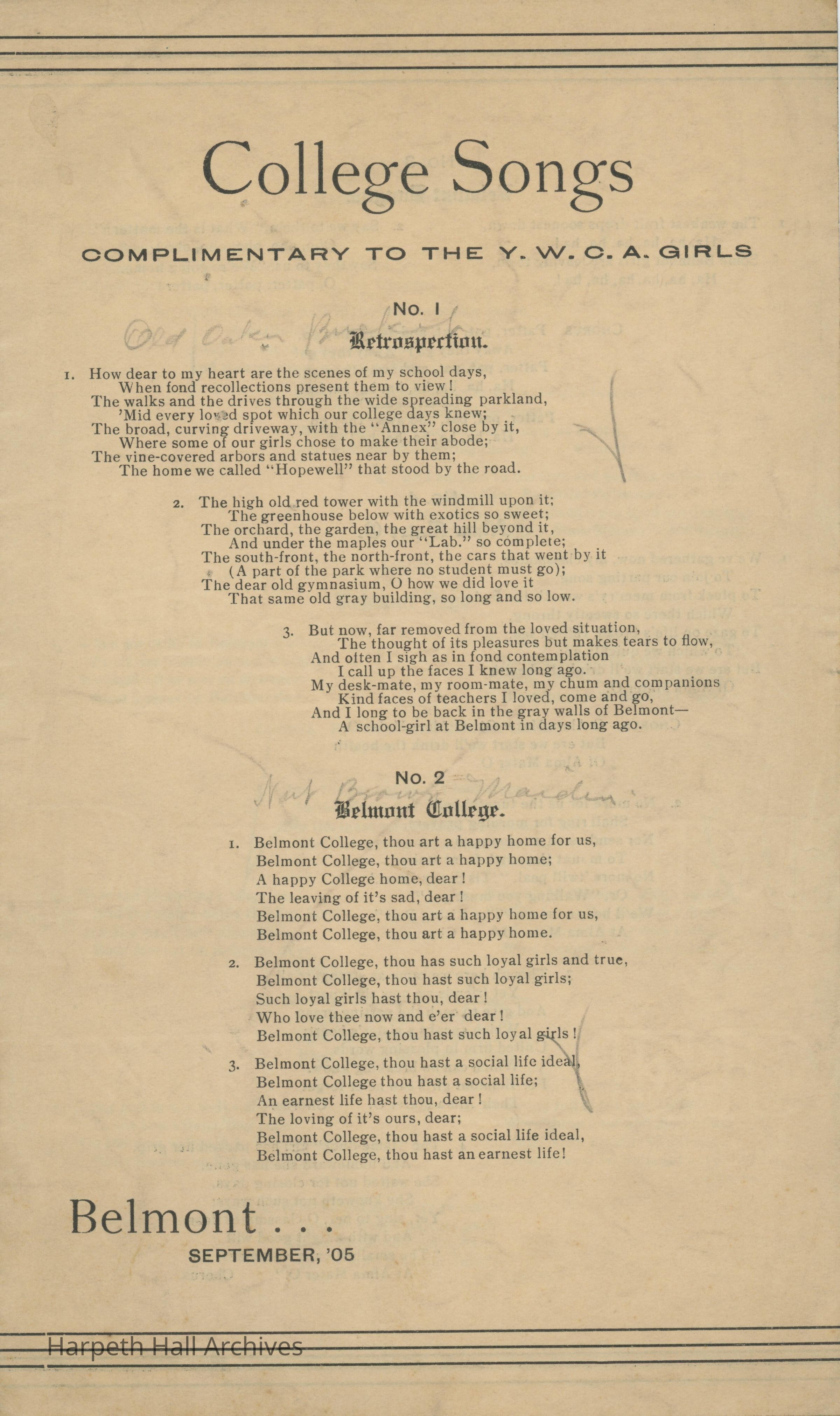 A list of college songs from Belmont College for Young Women printed in September of 1905.