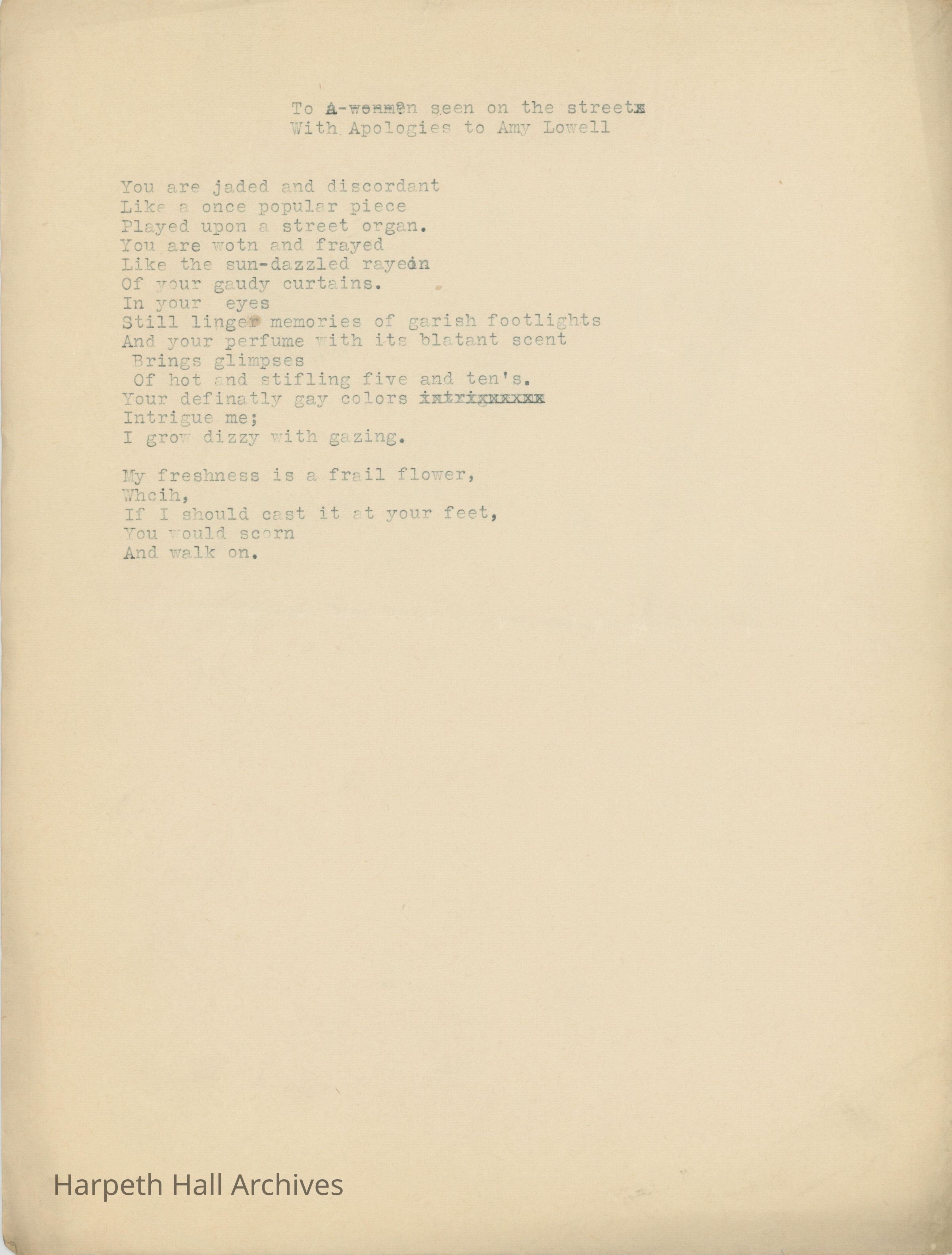 A poem entitled, "To a woman seen on the street (With Apologies to Amy Lowell)" written by a Ward-Belmont student.Collection