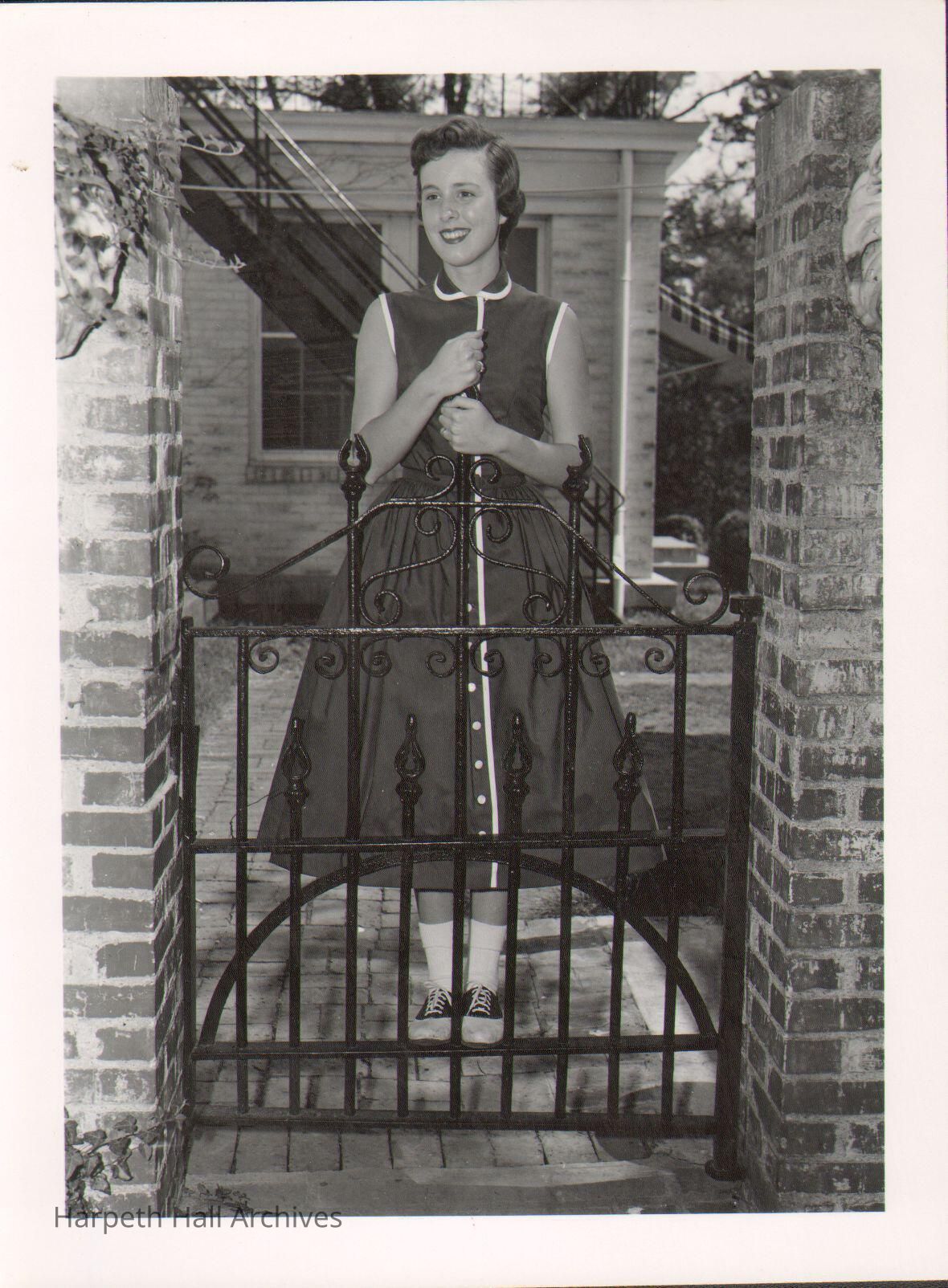 Student at iron gate next to Souby Hall, 1960s