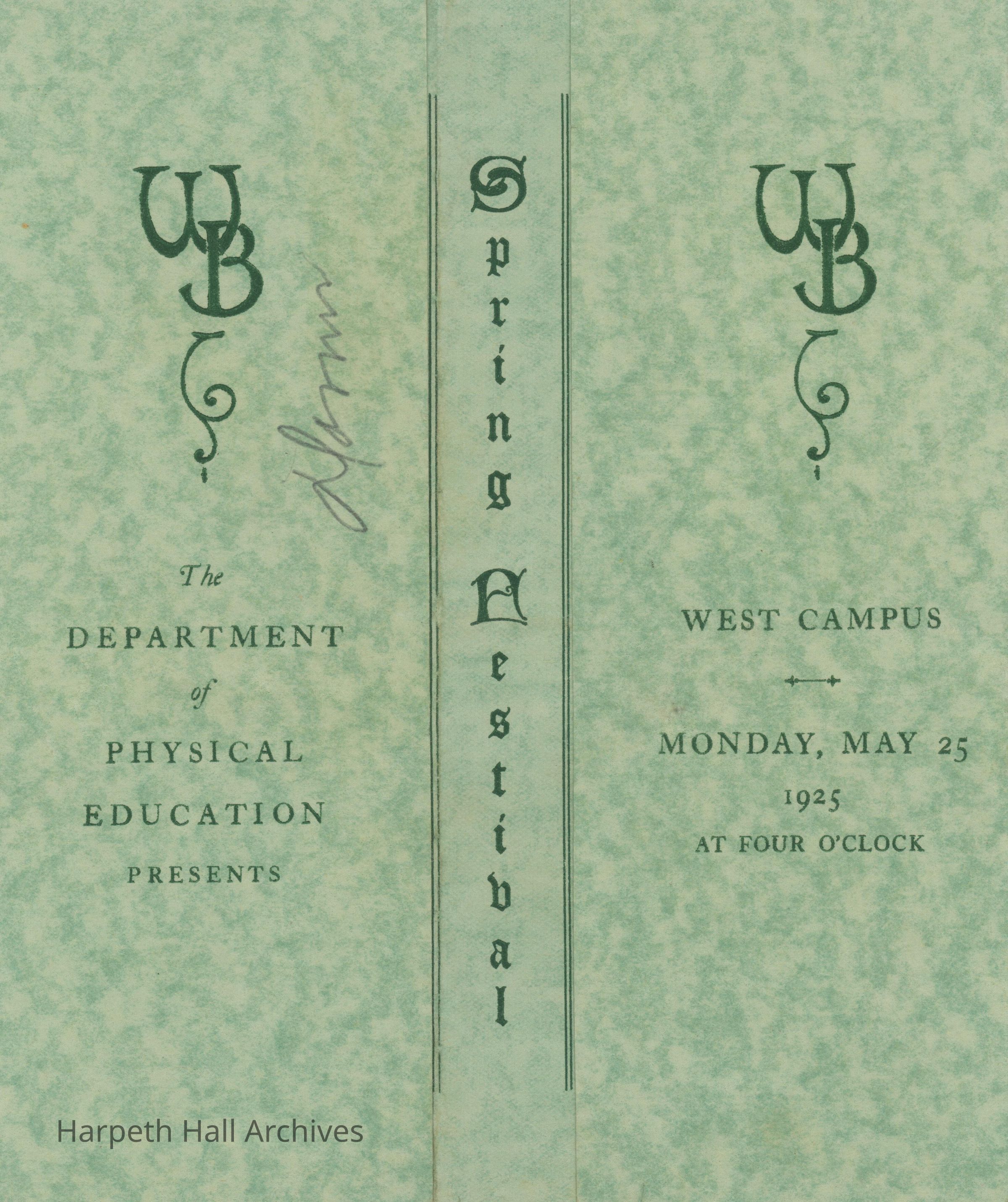 A program for the 1925 Ward-Belmont Spring Festival, presented by the Department of Physical Education. Held on the West Campus on Monday, May 25, 1925, at 4:00 P.M. The program consisted of four parts: a procession, the presentation of the May Queen and her court, spring dances, and the folk festival entertainment. The 1925 May Queen was Marietta Moss.Context