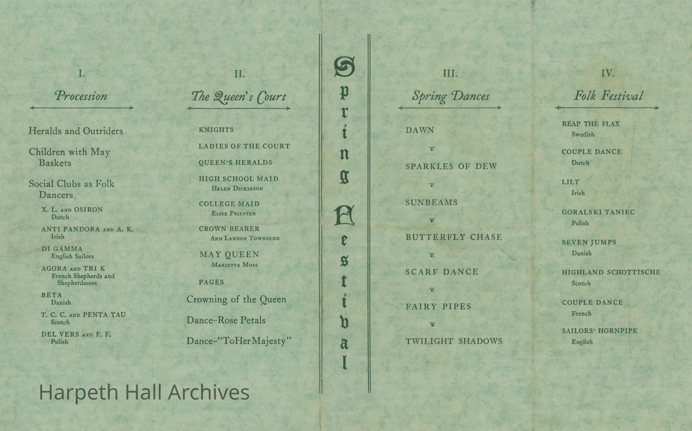 The annual May Day Festival was described as "the highlight of the social year at Ward-Belmont" (Milestones, 1945). The festivities involved dancing, processions, the crowning of the May Queen and her court, and the traditional May Pole Dance. The Lady of the Hall, Harpeth Hall's highest honor, evolved from the May Queen ceremony.Collection