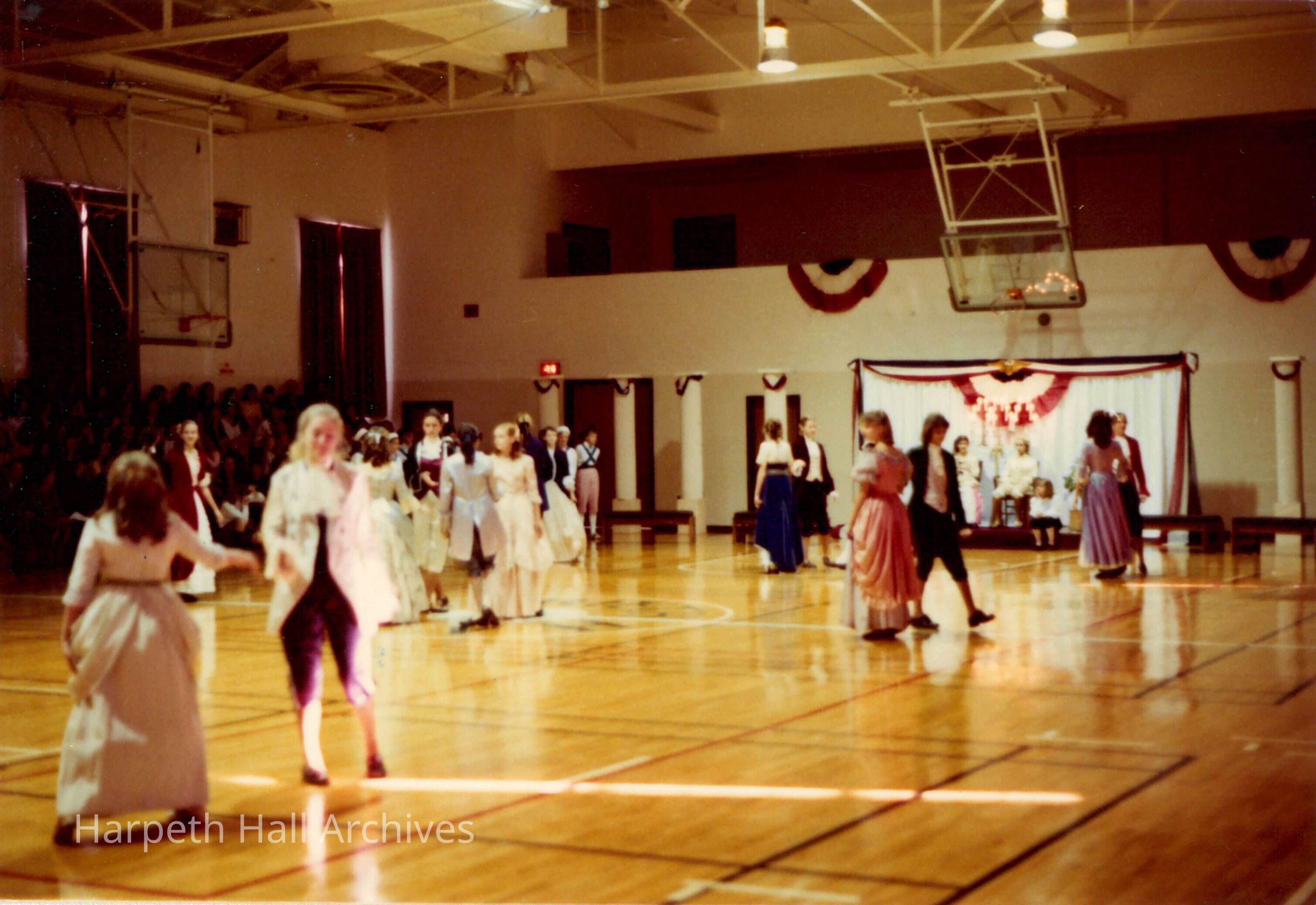 A group of seventh grade students performing a dance in the George Washington Day Celebration. The photo is taken in the Morrison Gym in the McMurry Center.Context