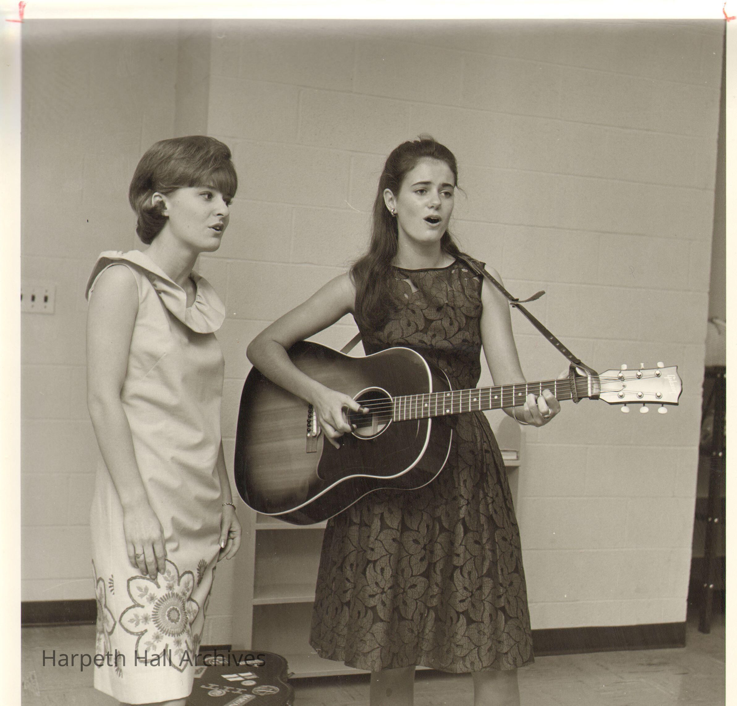 Two students performing, one with a guitar, in the 1960's.