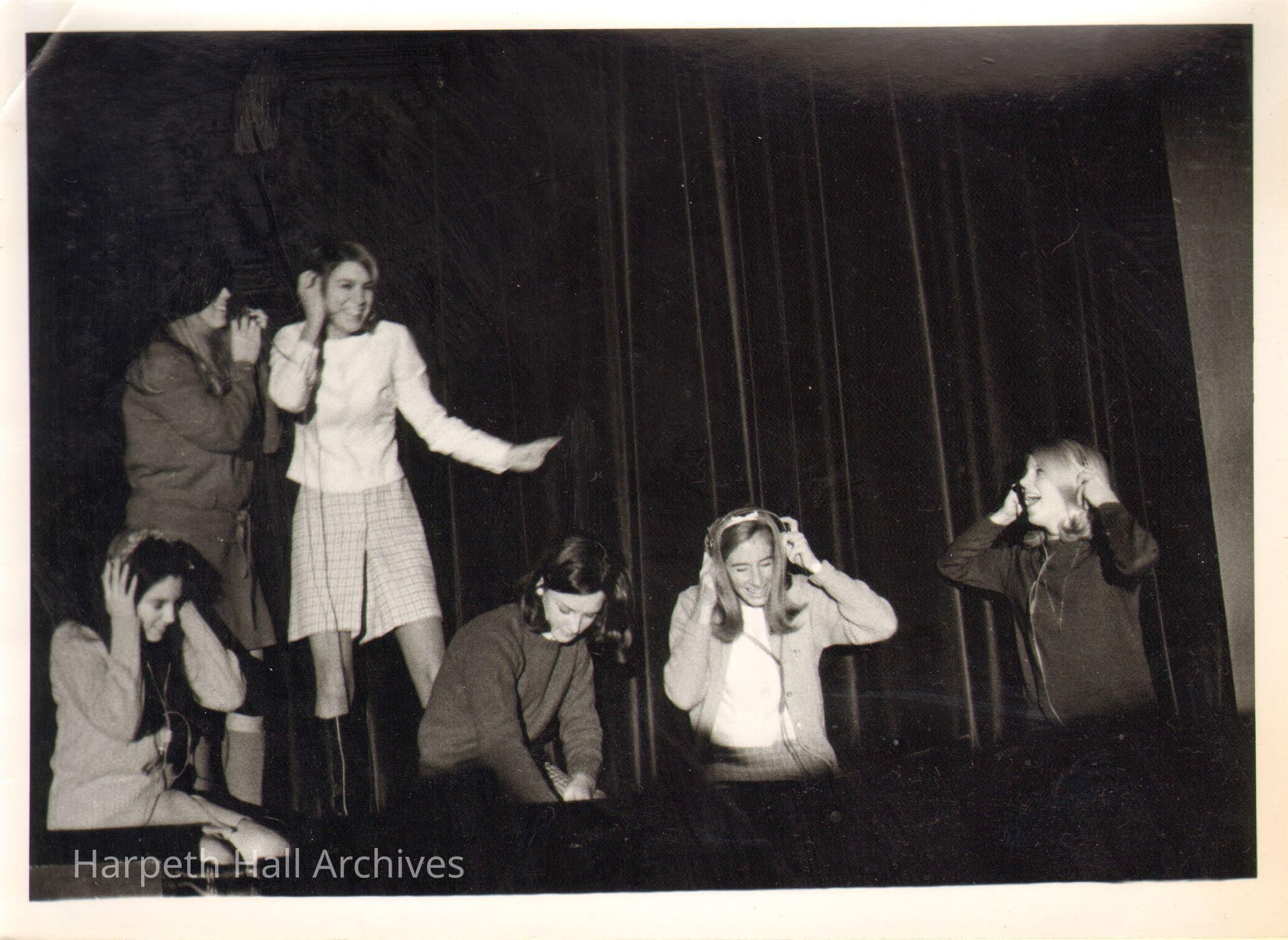 Students on stage with headphones, 1960s
