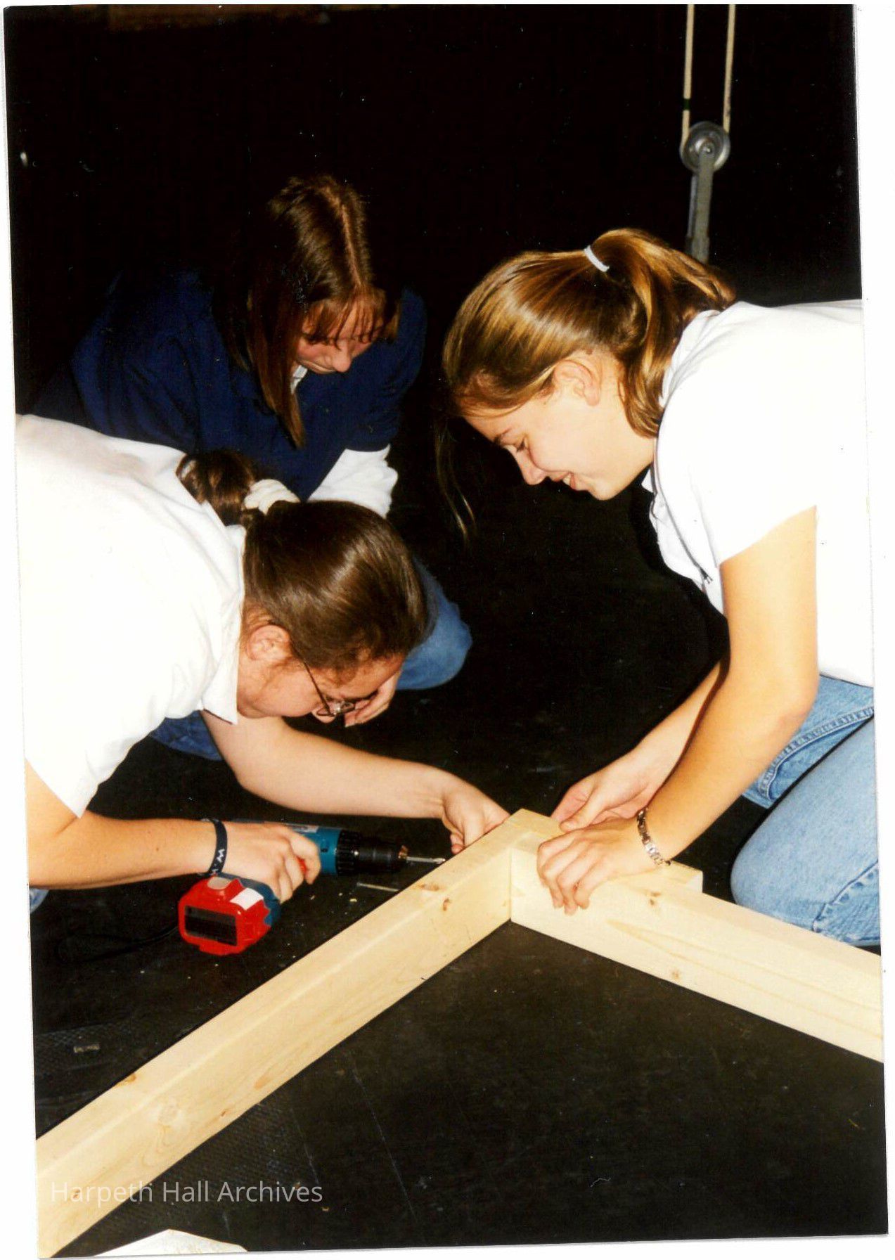 Course details from the 2000 Winterim course catalog: "If you love theatre and want to learn what goes into building a set and running a show, then this is the class for you! You will learn how to use power tools, swing a hammer, drill, paint, wash brushes, build a flat, leg a platform, etc. This class will help build the sets for the Middle School and Winterim productions and run tech for the Winterim show. This is a great opportunity to stage-manage — run the light board, run the soundboard, or even master the spotlights. CAUTION: You are expected to be at all tech rehearsals and evening performances after school the last week of Winterim!" This course was limited to an enrollment of 20 students.Photograph Details