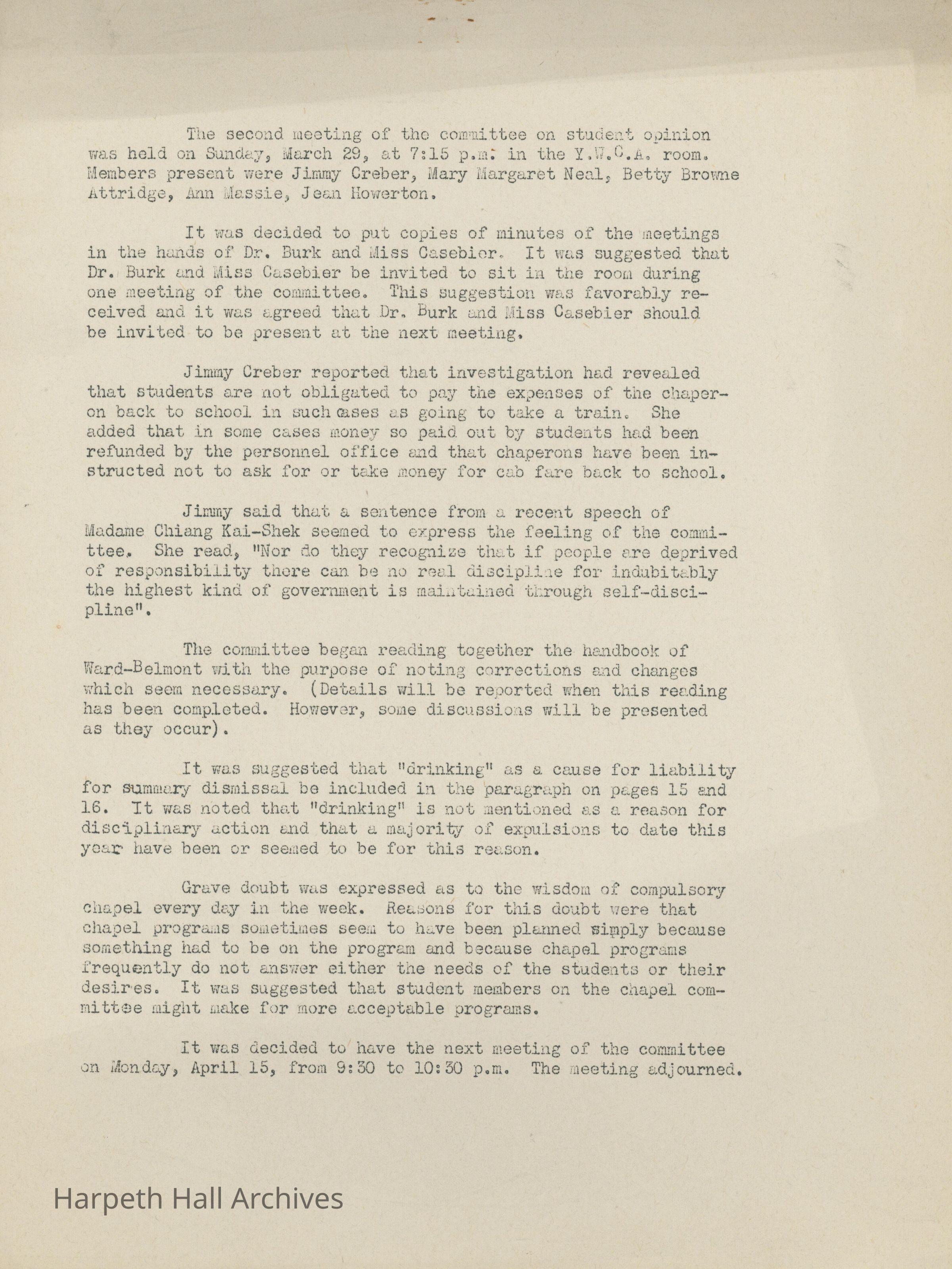 Student Opinion, Meeting Minutes, Ward-Belmont