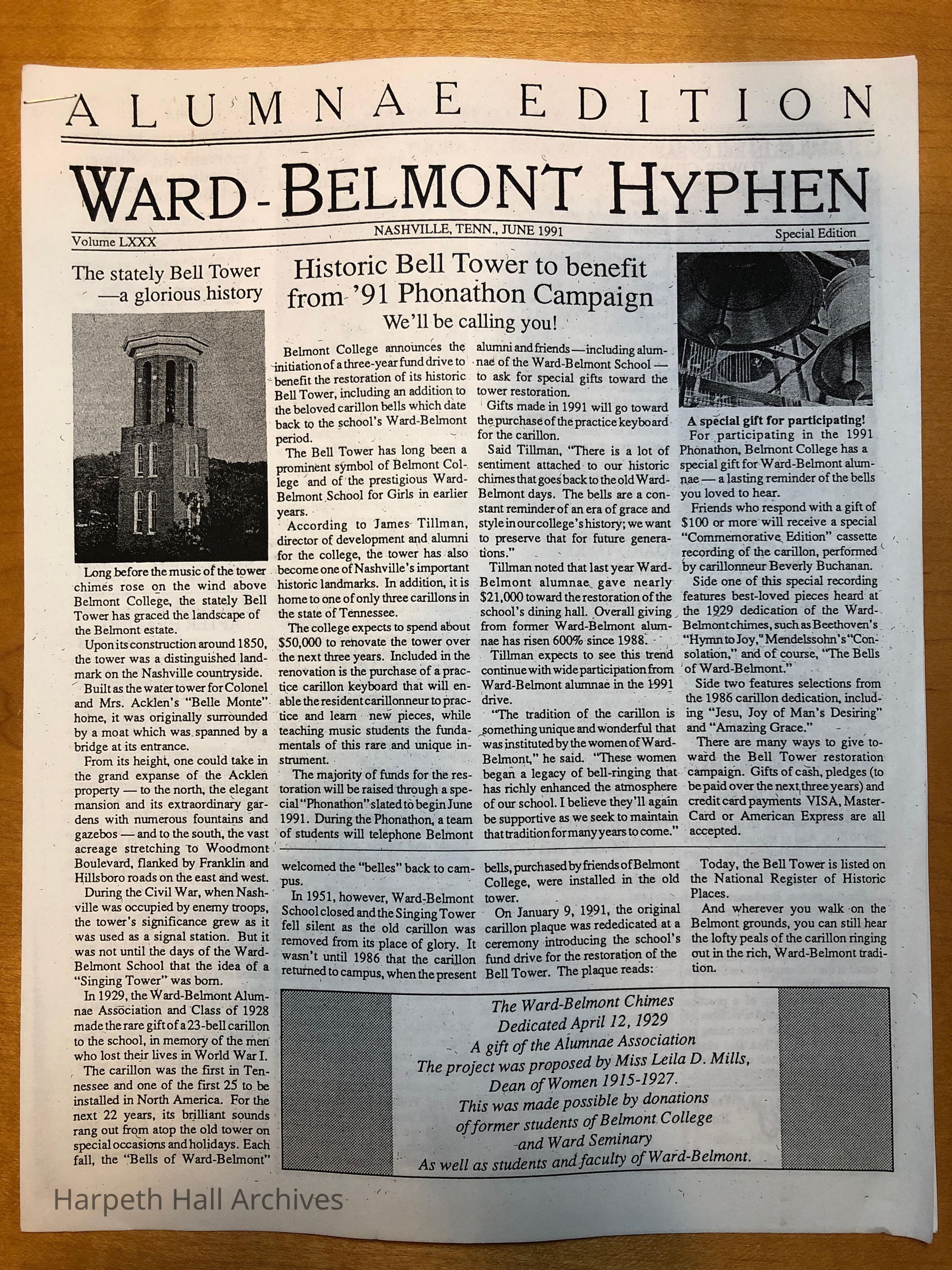 The June 1991st edition of the Ward-Belmont Hyphen. It is the alumnae edition, volume 80, special edition. Headline titled "Historic Bell Tower to benefit from '91 Phonathon Campaign"Collection
