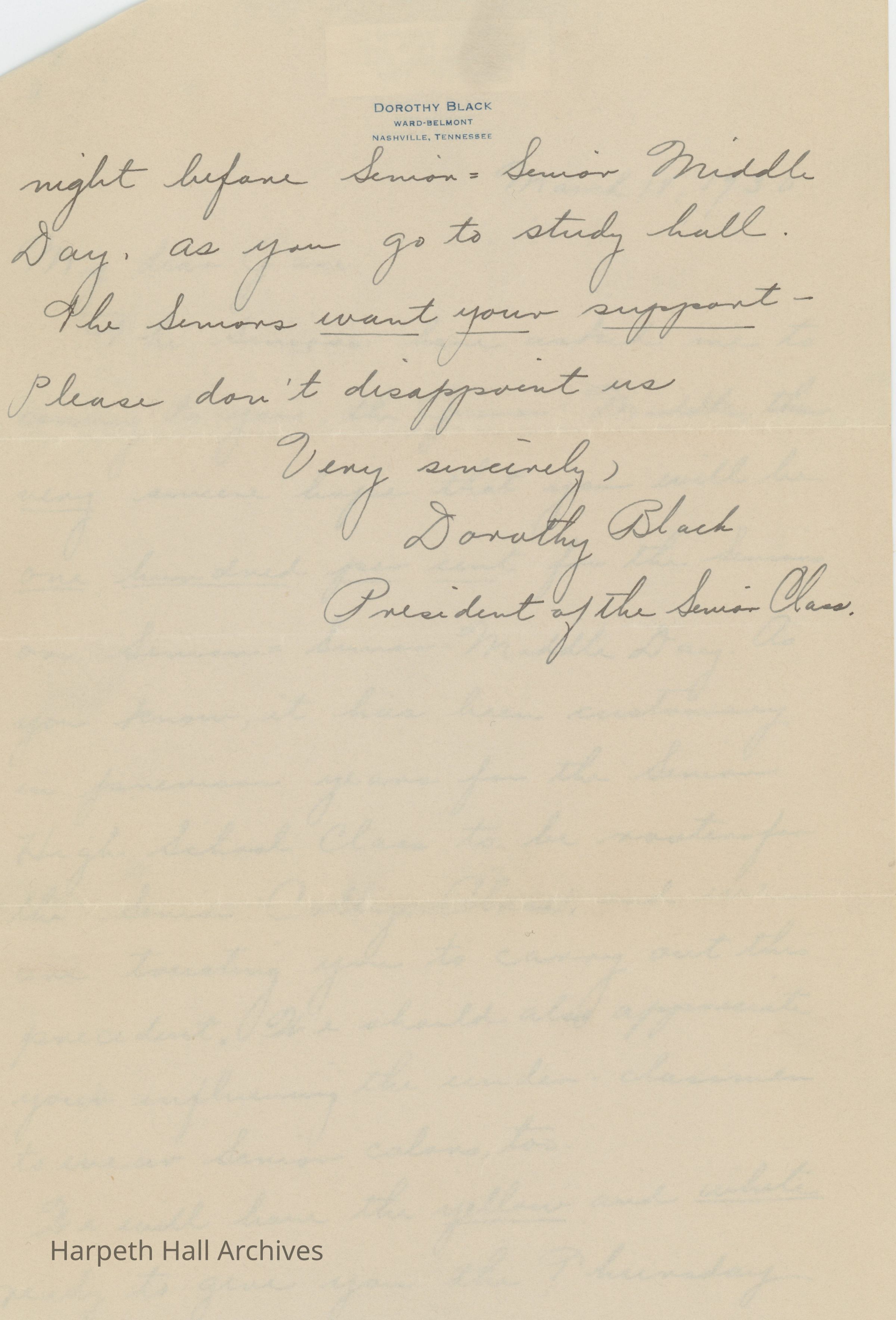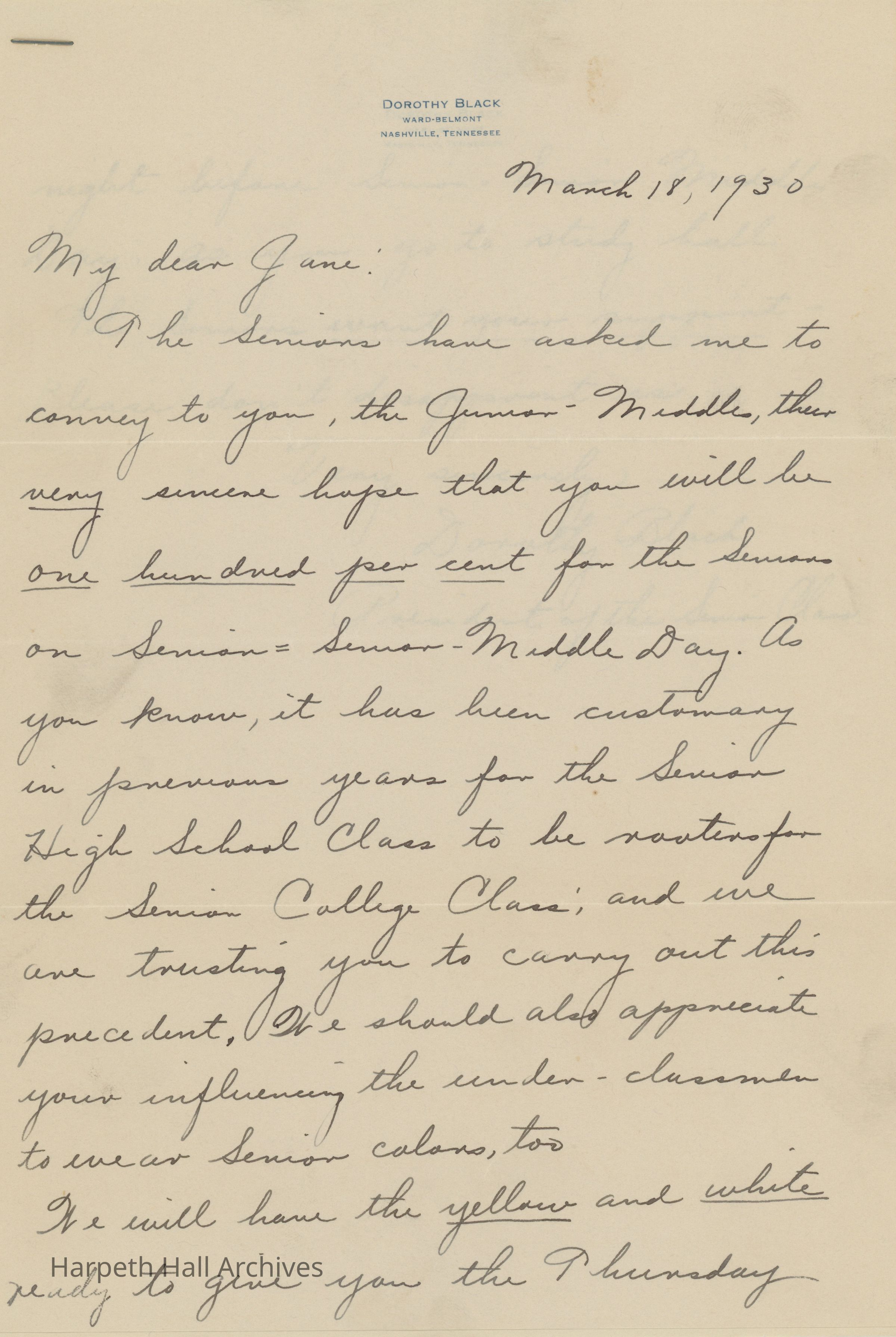 "My dear Jane: The Seniors have asked me to convey to you, the Junior-Middles, their very sincere hope that you will be one hundred percent for the Seniors on Senior-Senior Middle Day. As you know, it has been customary in previous years for the Senior High School Class to be rooters for the Senior College Class; and we are trusting you to carry out this precedent. We should also appreciate your influencing the under-classmen to wear Senior colors, too. We will have the yellow and white ready to give you the Thursday night before Senior-Senior Middle Day, as you go to study hall. The Seniors want your support - please don't disappoint us. Very Sincerely, Dorothy Black, President of the Senior Class."Context