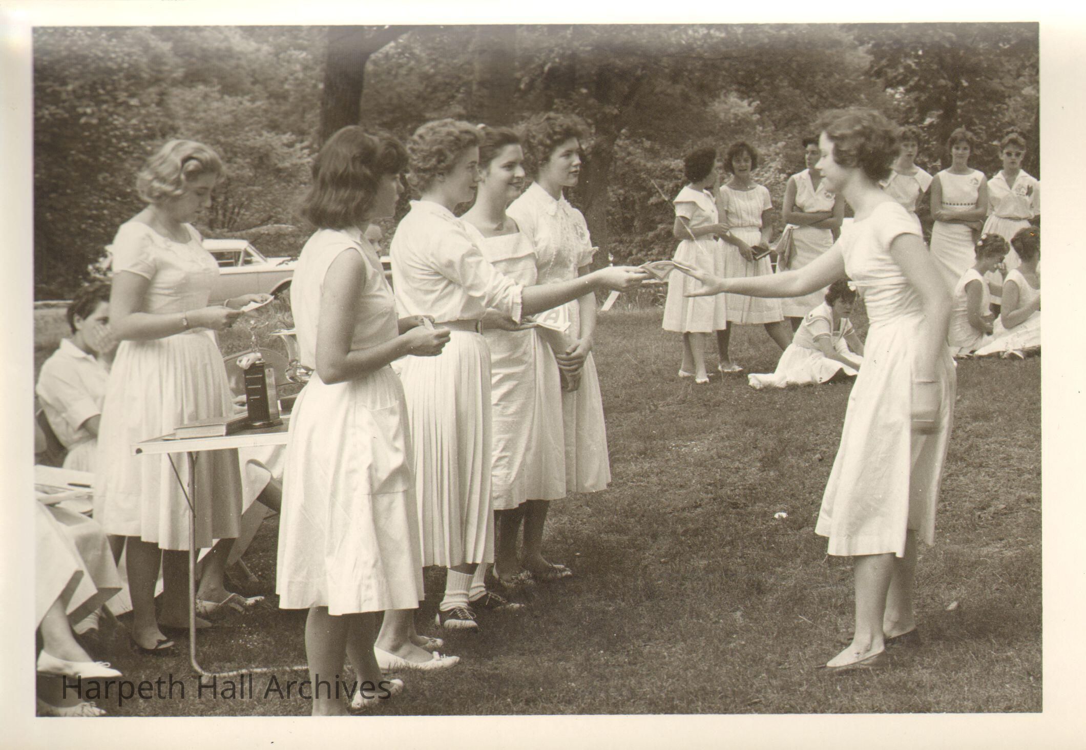 Students wearing short white dresses outside while in some type of ceremony receiving recognition and trophies.