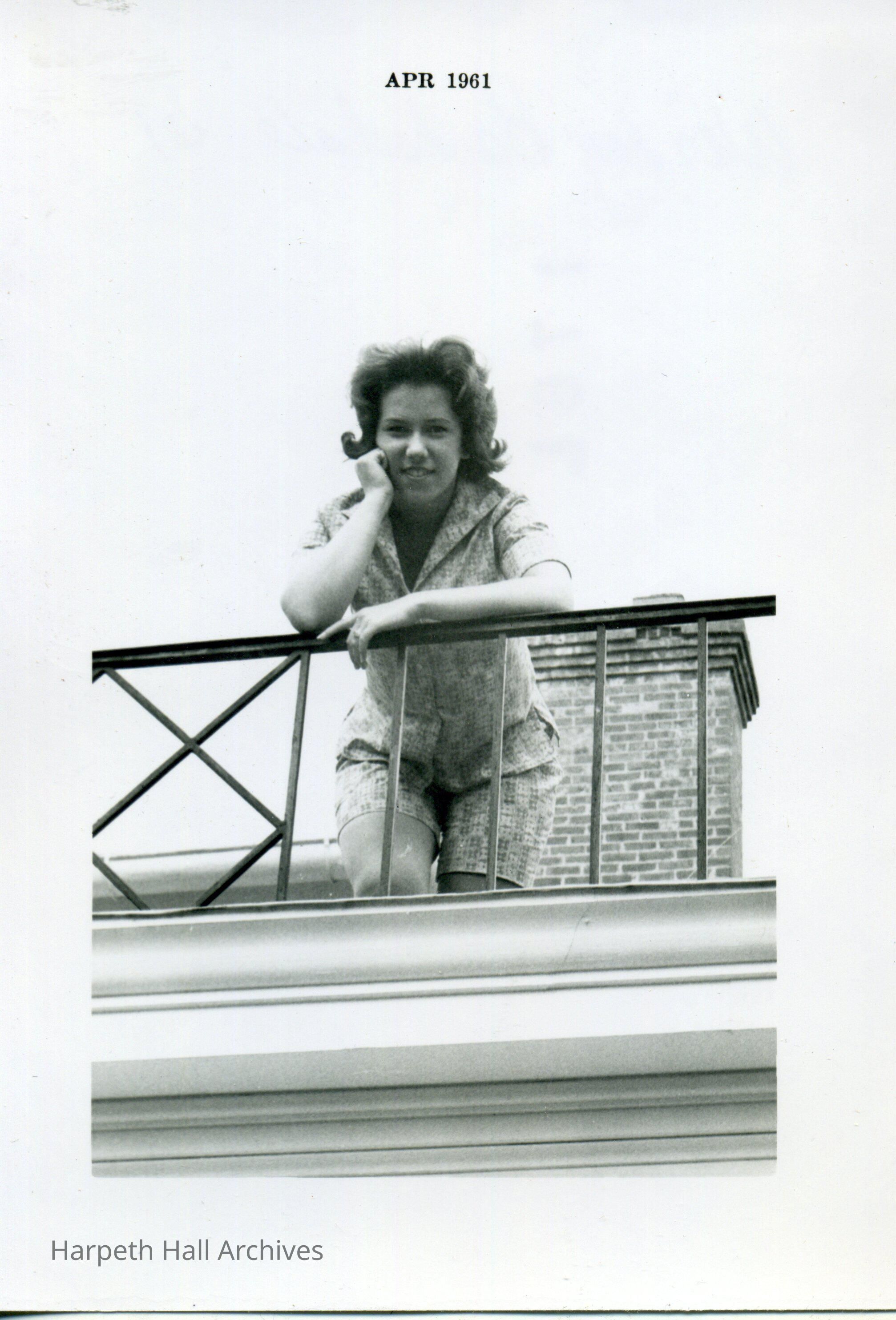 Mary "Winkie" Barksdale Huddleston (1961) standing on the rooftop of Souby Hall.