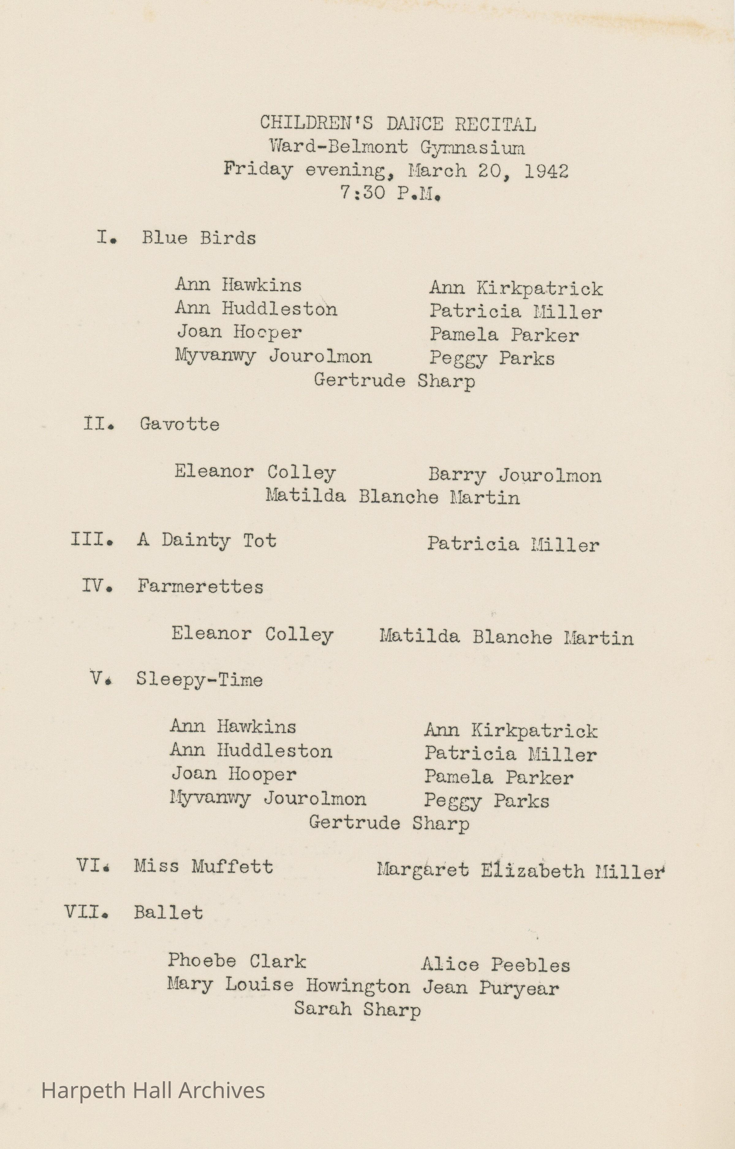 A program for a children's dance recital at the Ward-Belmont gymnasium, held on Friday evening, March 20, 1942, at 7:30 P.M. The recital consisted of 7 dances. The names of the performers are listed in the program under their respective dance numbers.Collection