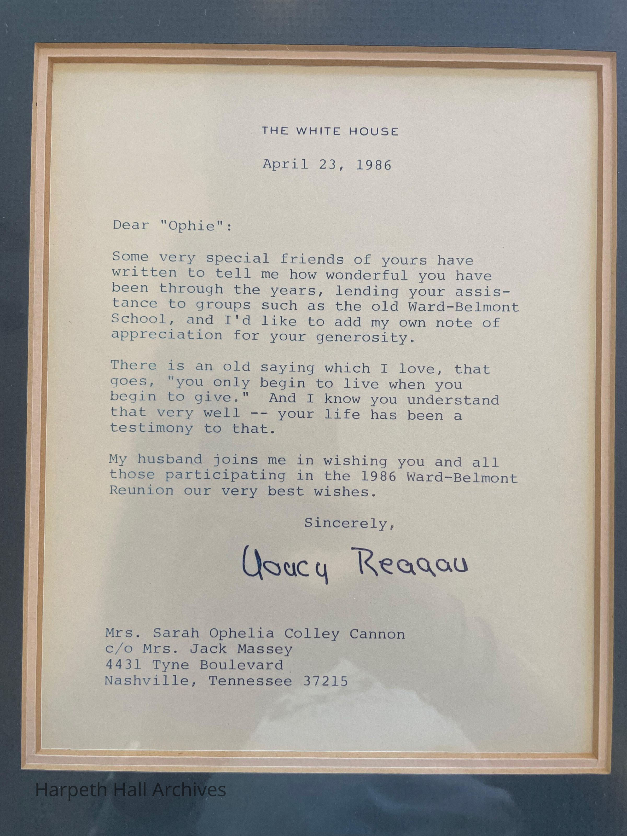 A letter from Nancy Reagan written to Mrs. Sarah Ophelia Colley Cannon "Minnie Pearl" on April 23, 1986Collection