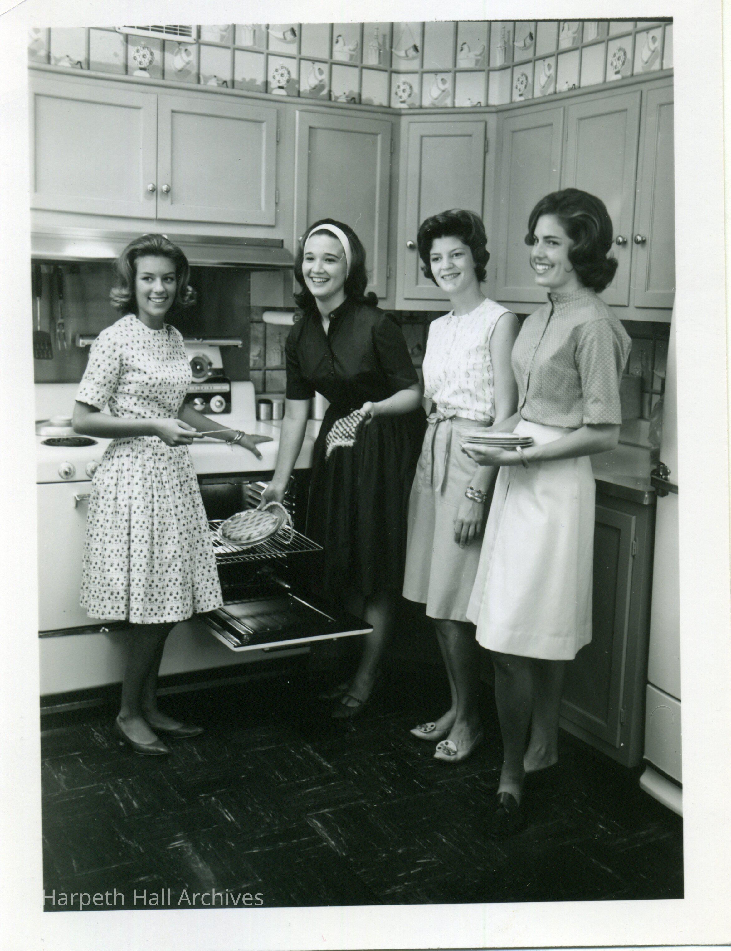 Four 1963 seniors pose in a kitchen as the Senior Superlatives. Pictured: Nickye Yokley Venters (1963), Pamela "Pam" Polk McKnight (1963), Emily Baker Irvin (1963)