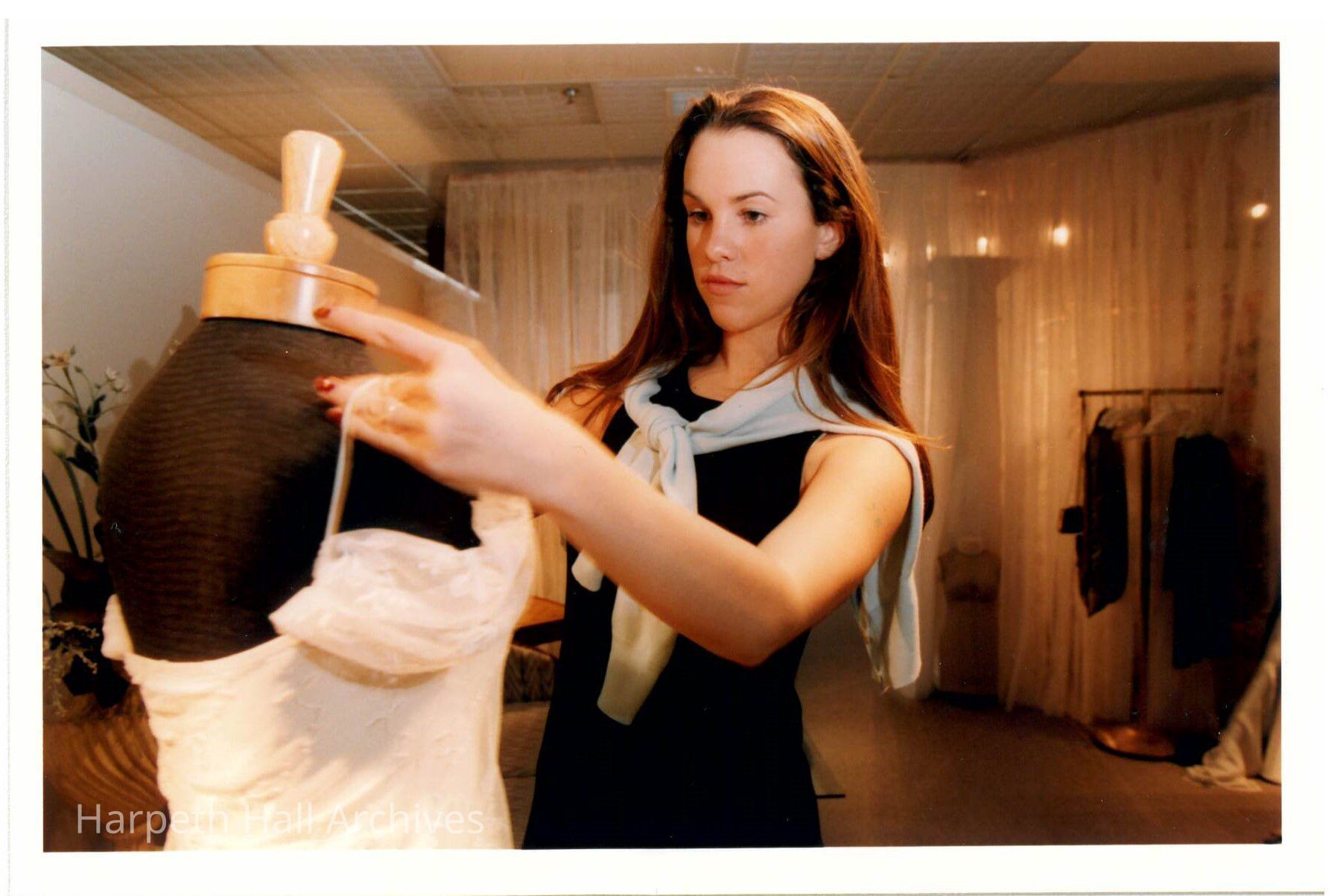 A photo of then-junior Amanda Norman (class of 2000) working in fashion design/clothing/sewing during Winterim 1999.Photograph Details