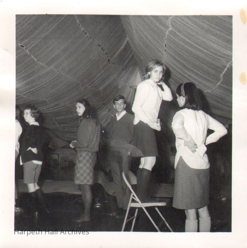 Lee Harris Elledge (1969), Martha Sanders Chastain (1974), Retha Rudolph Church (1970) in the 1970's hanging a fabric awning inside the building.