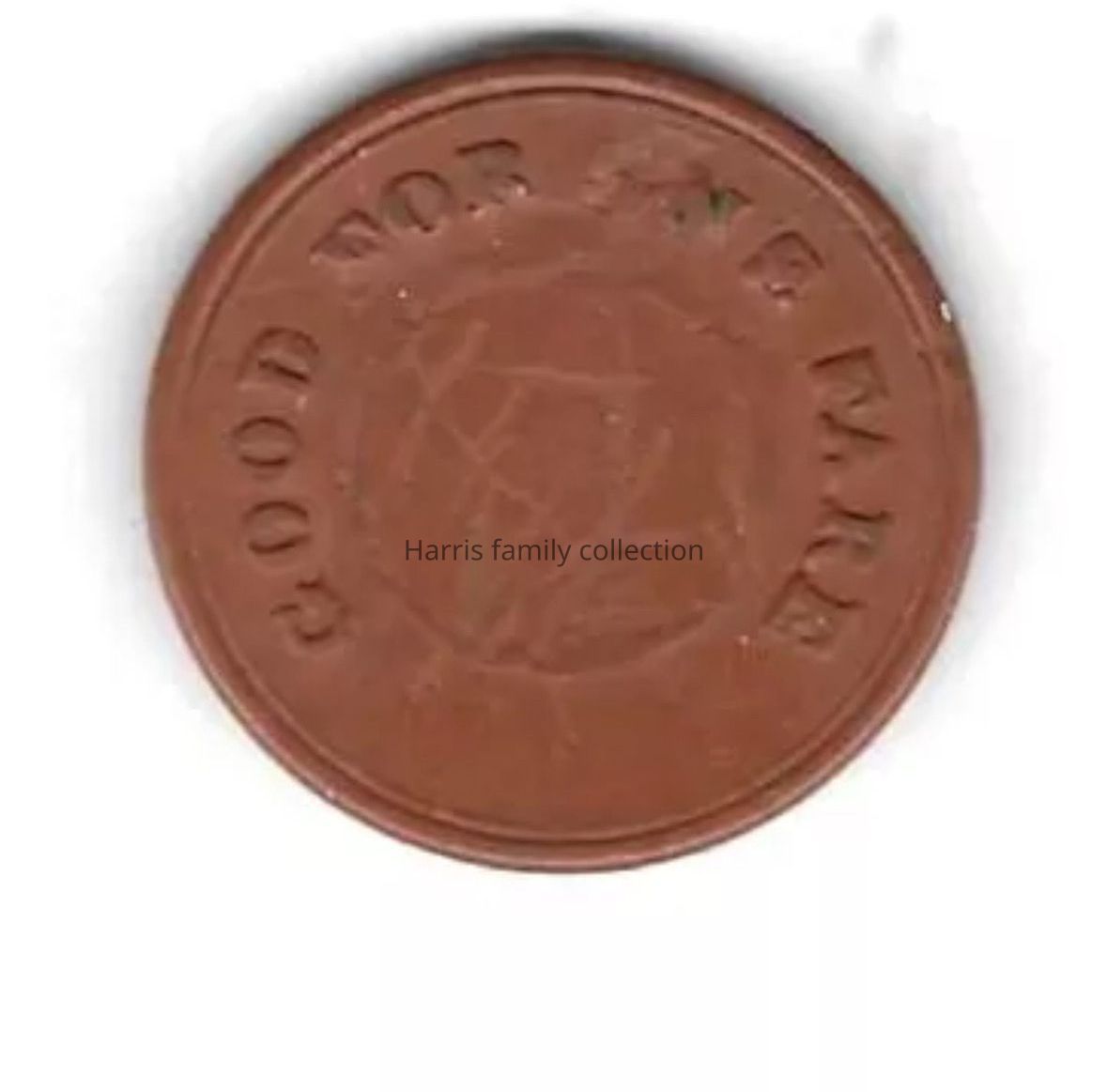 The token is brown vulcanite, 23mm. It is circa 1880s. It has Coffee-Ford catalog #180B. There are scratches in the center of the obverse and in the center of the reverse.