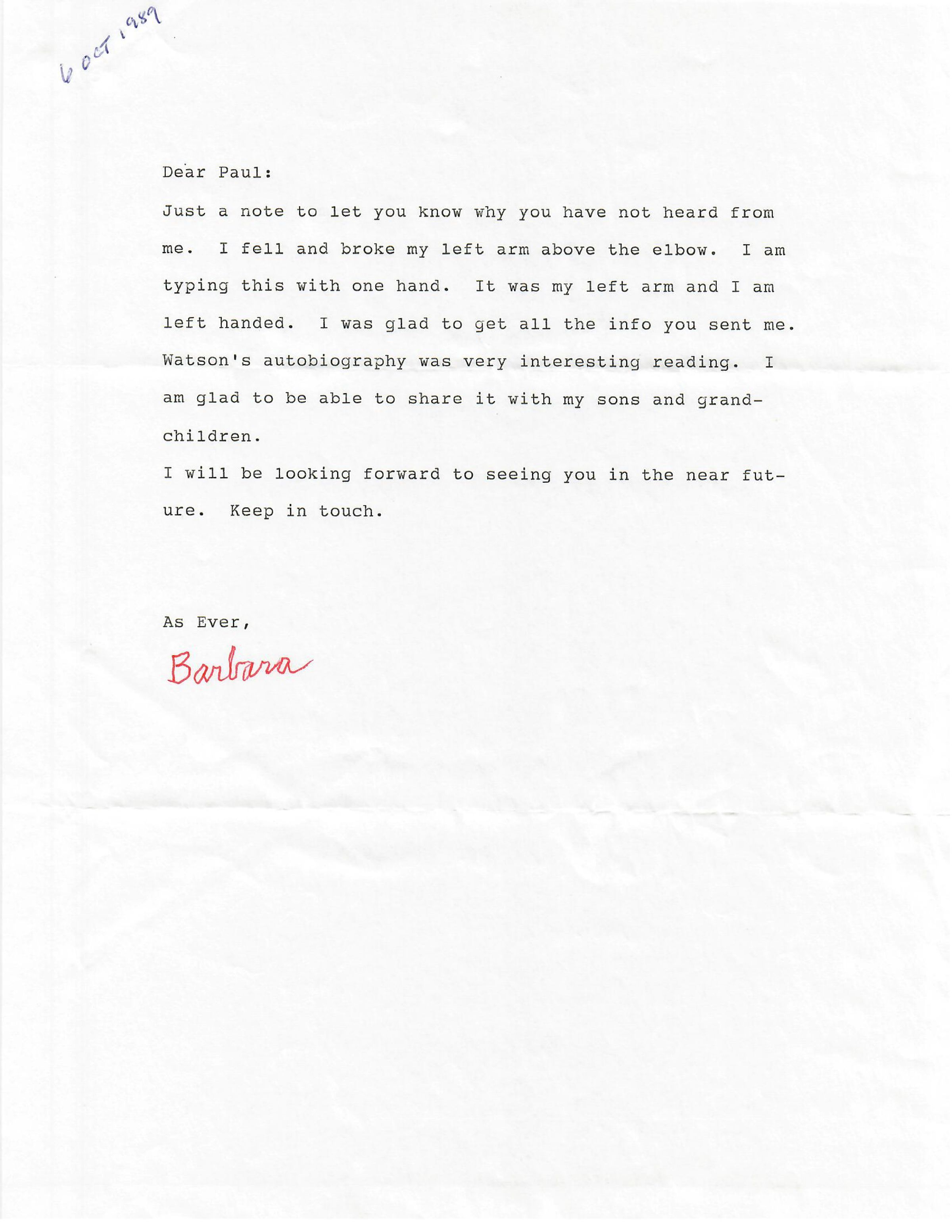 Just a note to let you know why you have not heard from me. I fell and broke my left arm above the elbow. I am typing this with one hand. It was my left arm and I am left handed. I was glad to get all the info you sent me. Watson's autobiography was very interesting reading. I am glad to be able to share it with my sons and grandchildren.