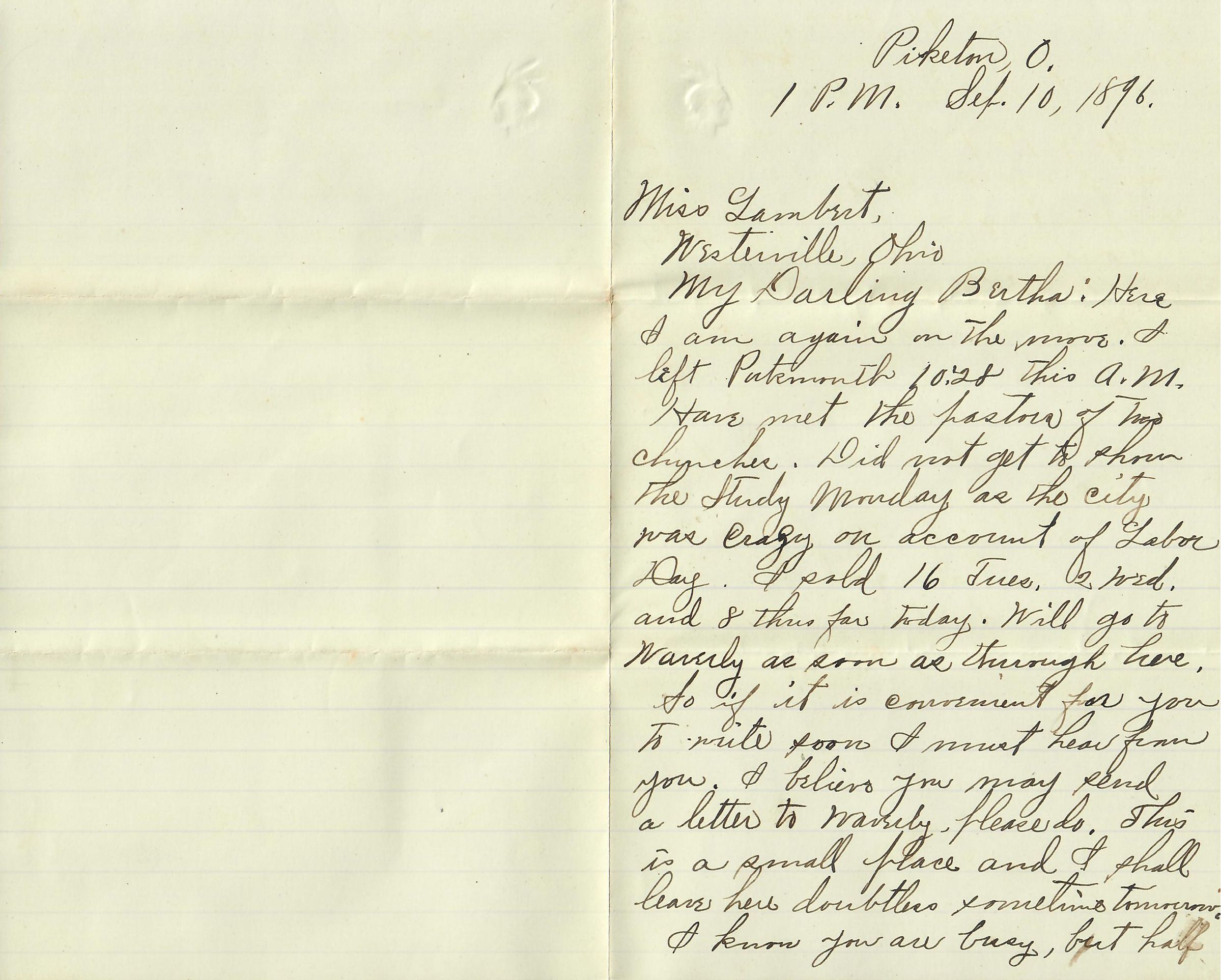 My Darling Bertha: Here I am again on the move. I left Portsmouth 10:28 this A.M. Have met the pastors of two churches. Did not get to show the Study Monday as the city was crazy on account of Labor Day. I sold 16 Tues. 2 Wed. and 8 thus far today. Will go to Waverly as soon as through here.