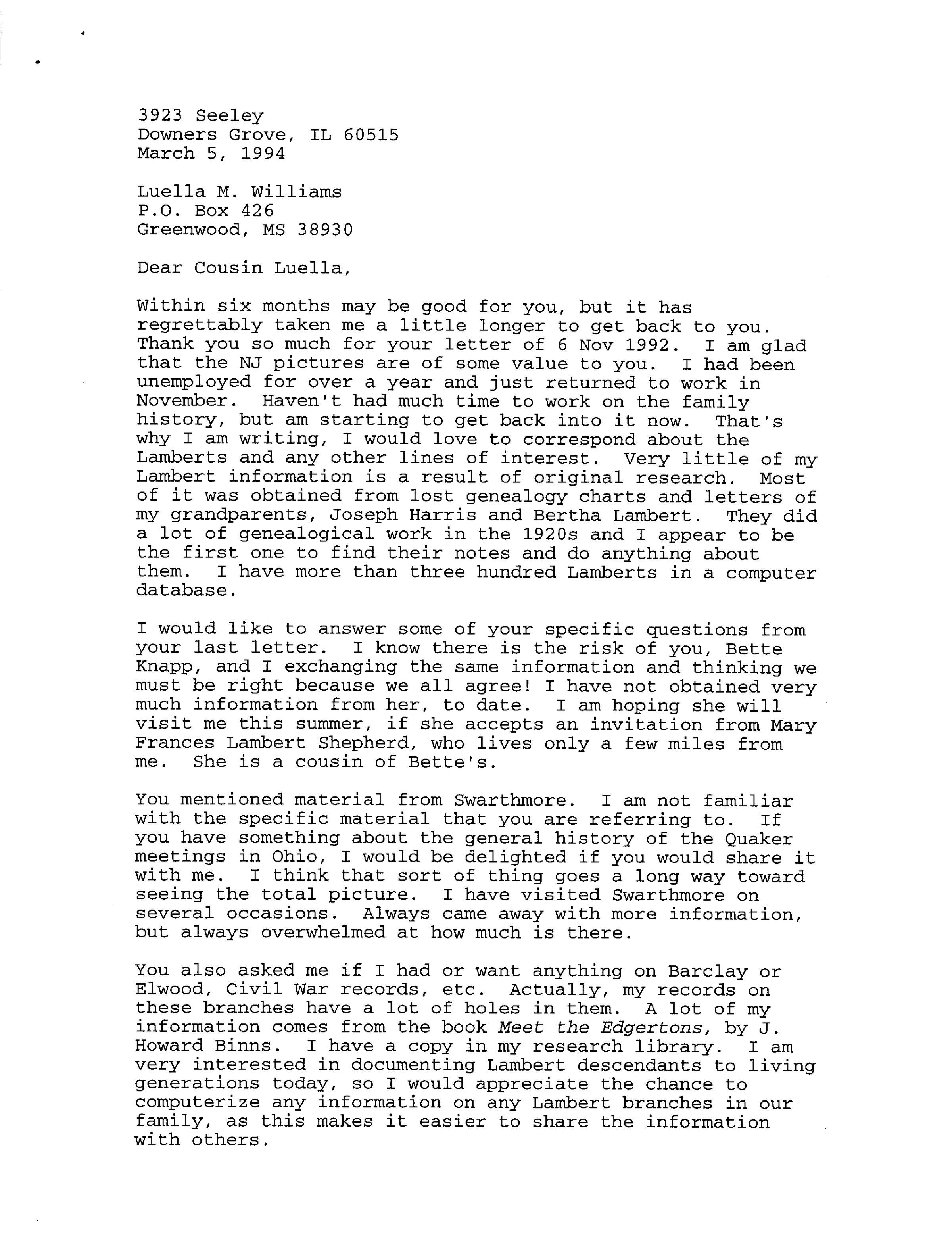 You also asked me if I had or want anything on Barclay or Elwood, Civil War records, etc. Actually, my records on these branches have a lot of holes in them. A lot of my information comes from the book Meet the Edgertons, by J. Howard Binns. I have a copy in my research library. I am very interested in documenting Lambert descendants to living generations today, so I would appreciate the chance to computerize any information on any Lambert branches in our family, as this makes it easier to share the information with others.