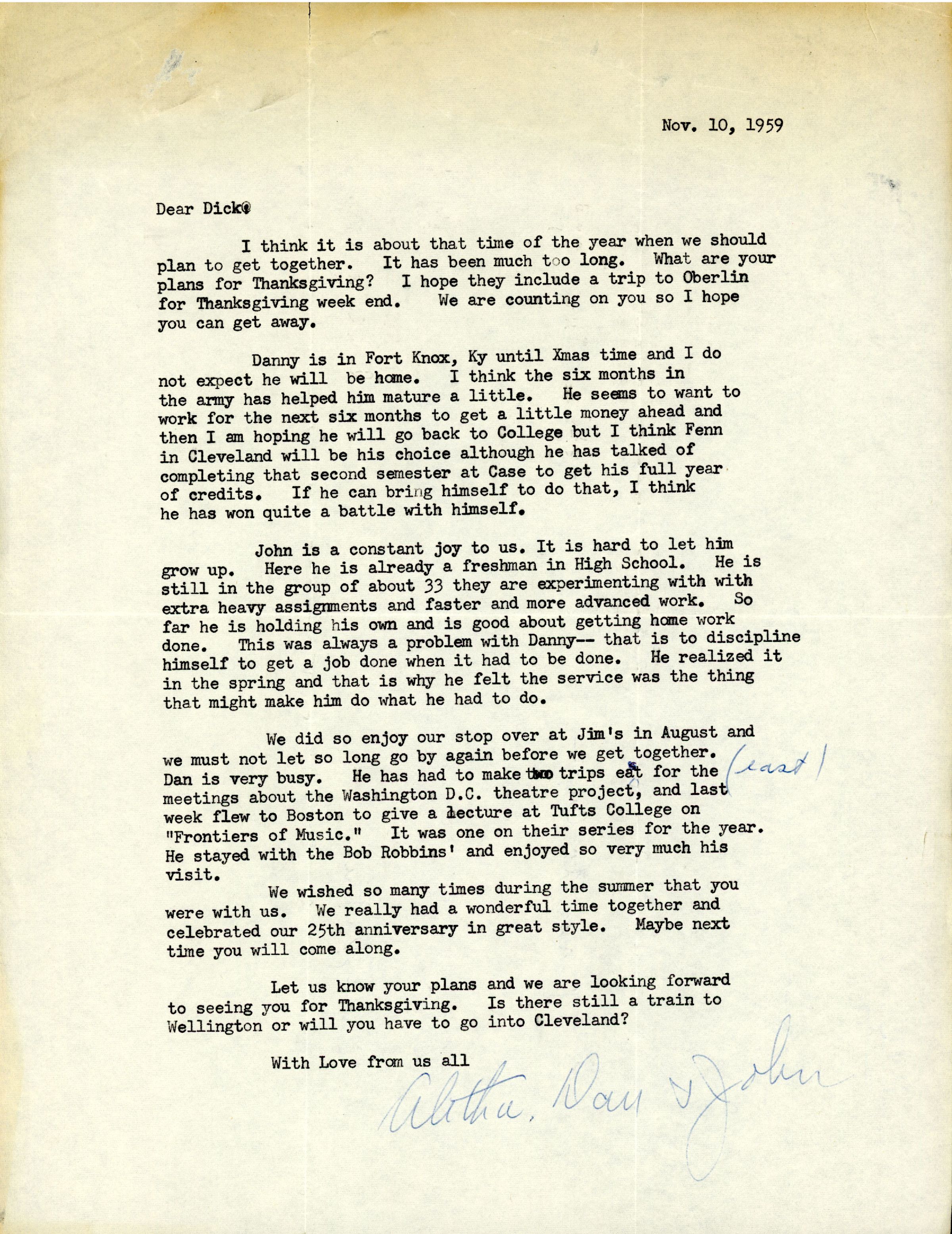 I think it is about that time of the year when we should plan to get together. It has been much too long. What are your plans for Thanksgiving? I hope they include a trip to Oberlin for Thanksgiving week end. We are counting on you so I hope you can get away.