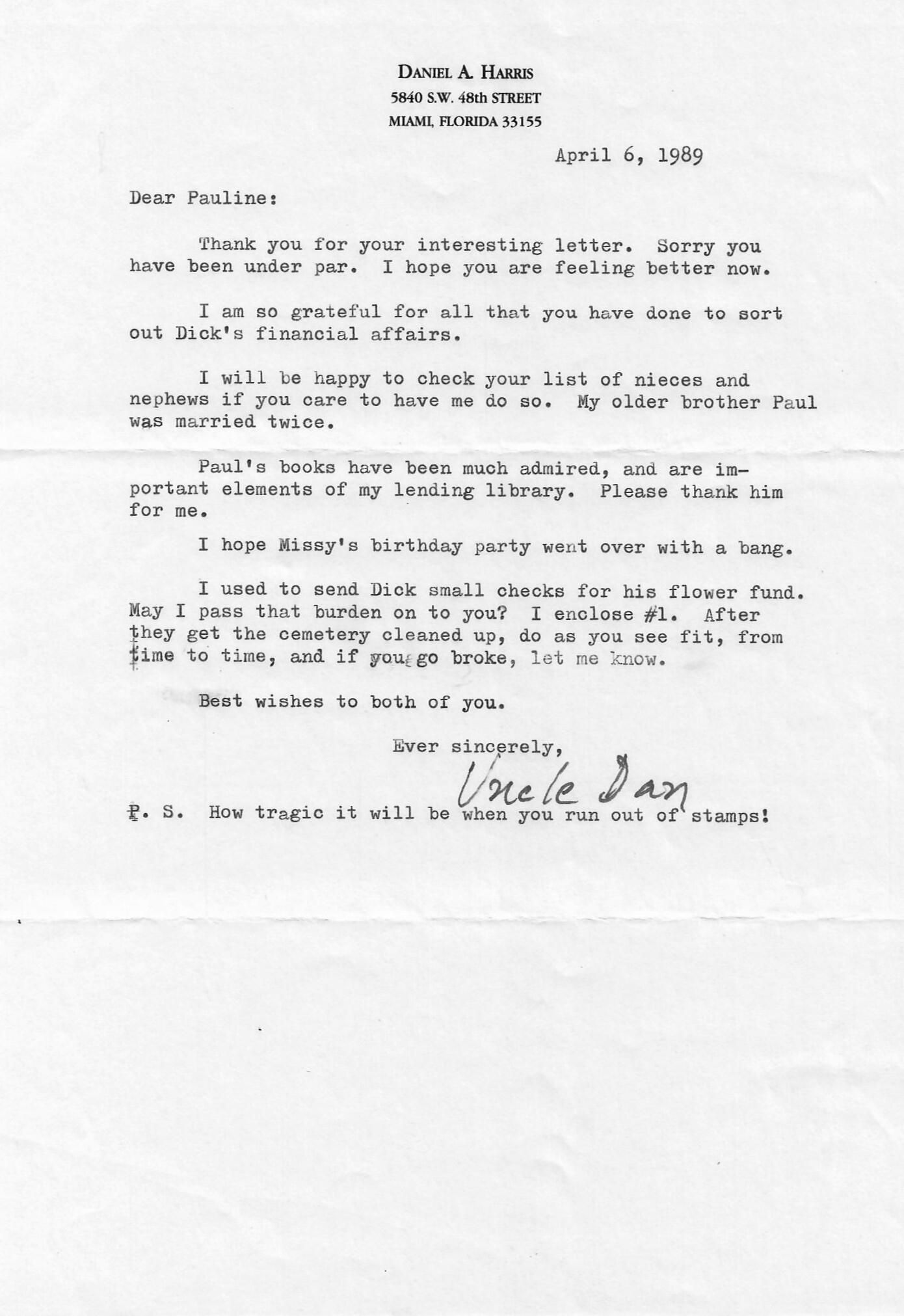AU Harris, Daniel Alfred - 1989-04-06 letter to Pauline BierleyEntry/Object ID