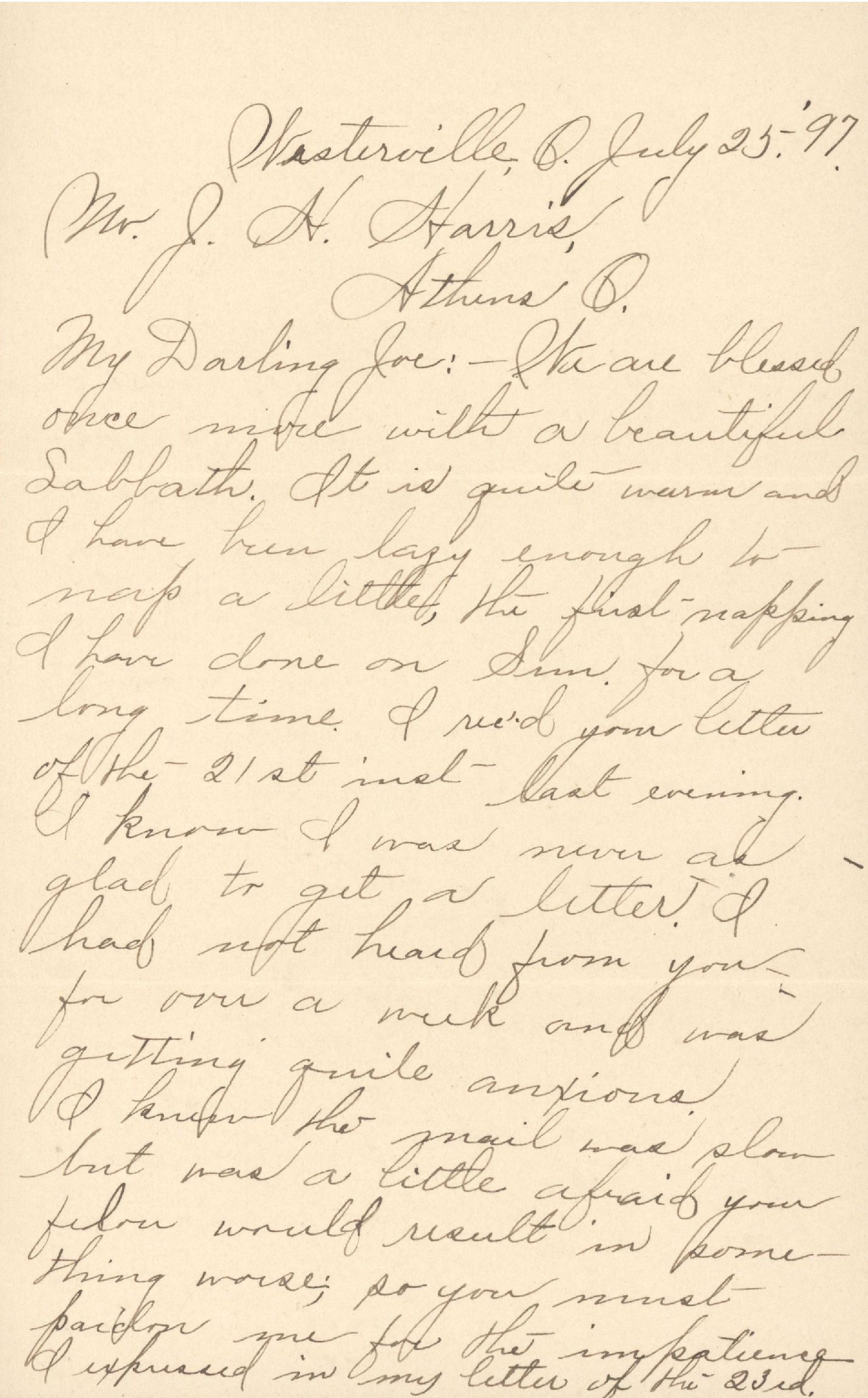 My Darling Joe: — We are blessed once more with a beautiful Sabbath. It is quite warm and I have been lazy enough to nap a little, the first napping I have done on Sun. for a long time. I rec'd your letter of the 21st inst last evening. I know I was never as glad to get a letter. I had not heard from you for over a week and was getting quite anxious. I knew the mail was slow but was a little afraid your felon would result in something worse; so you must pardon me for the impatience I expressed in my letter of the 23rd.