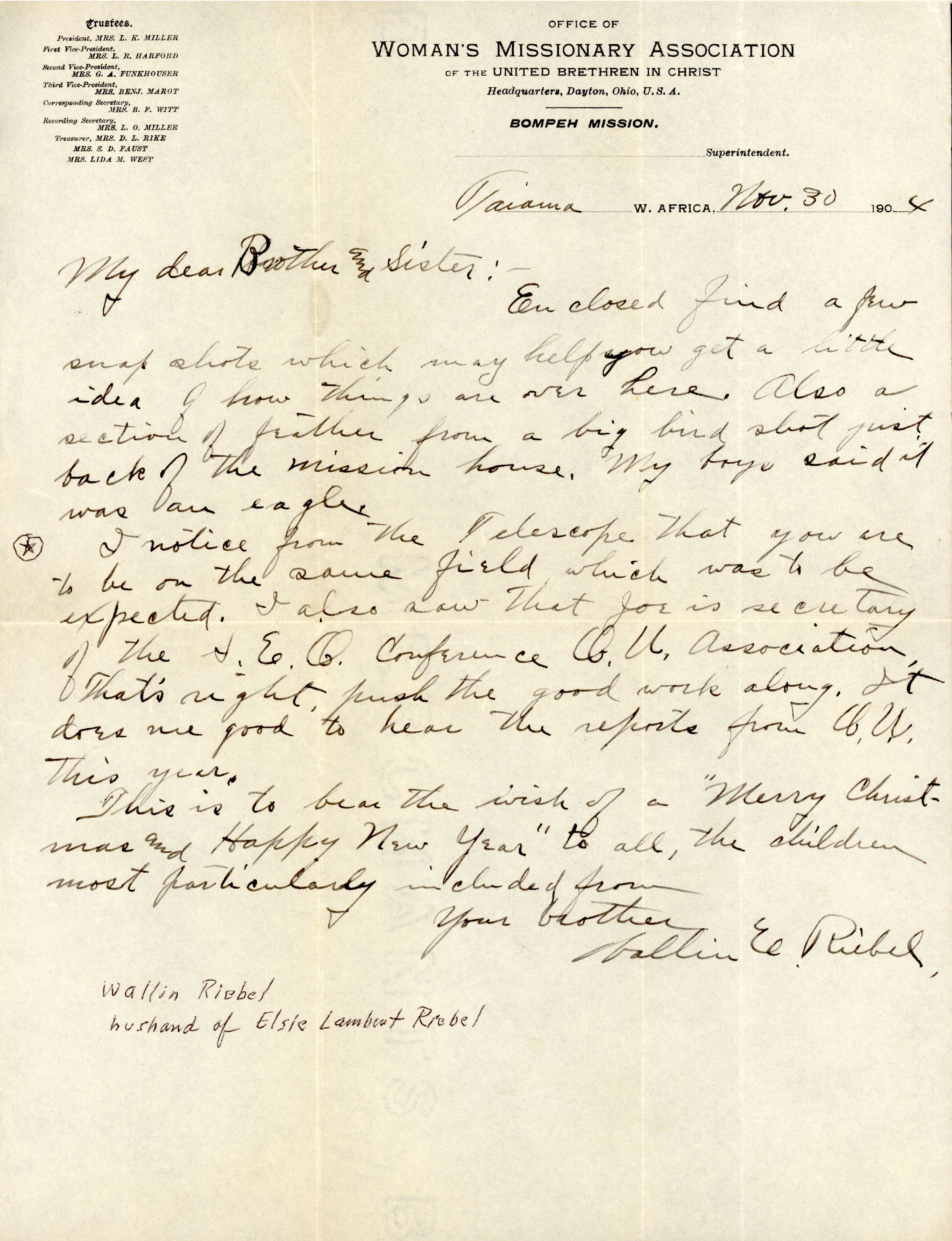 AU Riebel, Wallin Eleazar - 1904-11-30 Letter to Joseph and Bertha (Lambert) HarrisEntry/Object ID