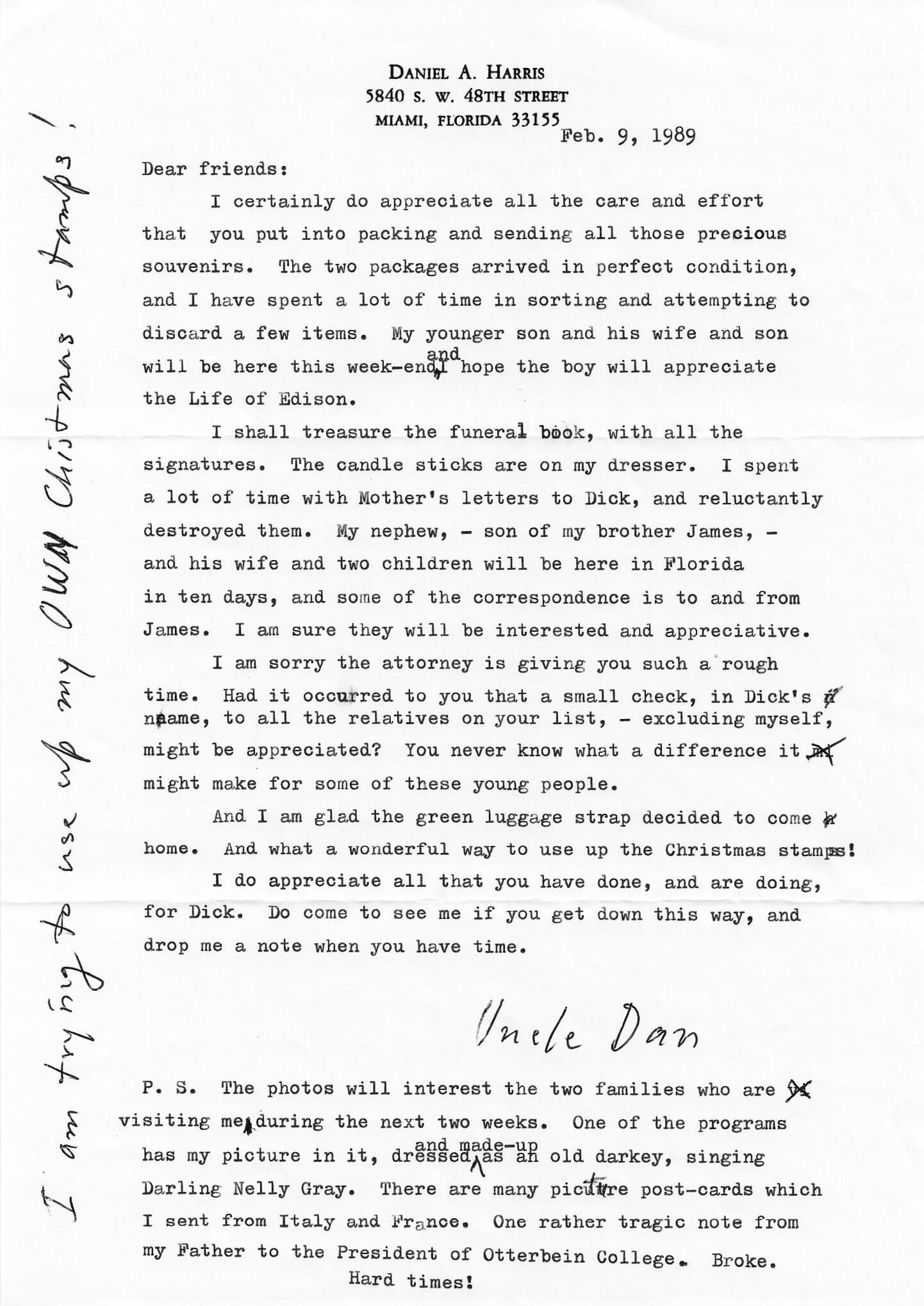 AU Harris, Daniel Alfred - 1989-02-09 letter to Paul and Pauline BierleyEntry/Object ID