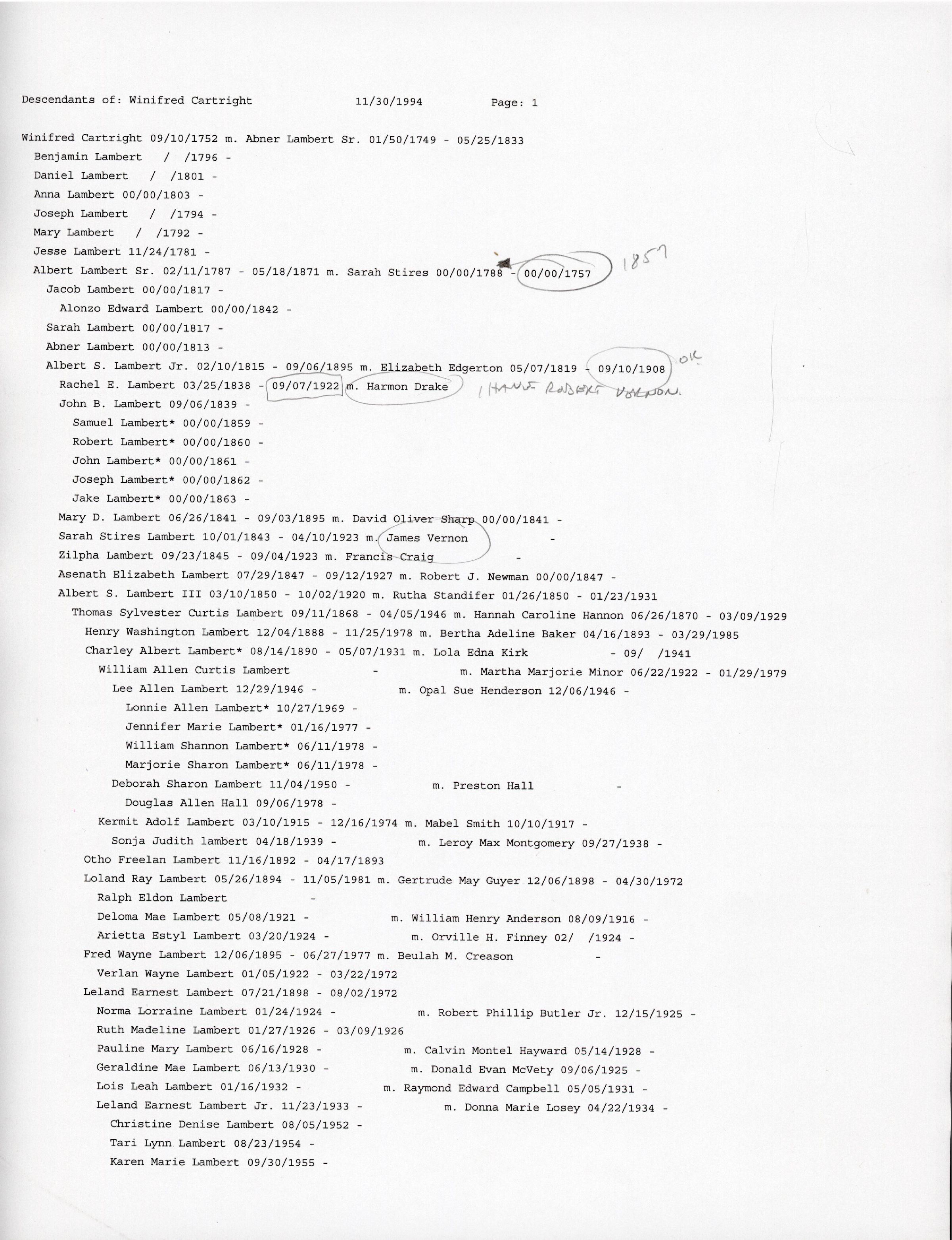 Descendants of: Winifred Cartright 11/30/1994 Page: 1