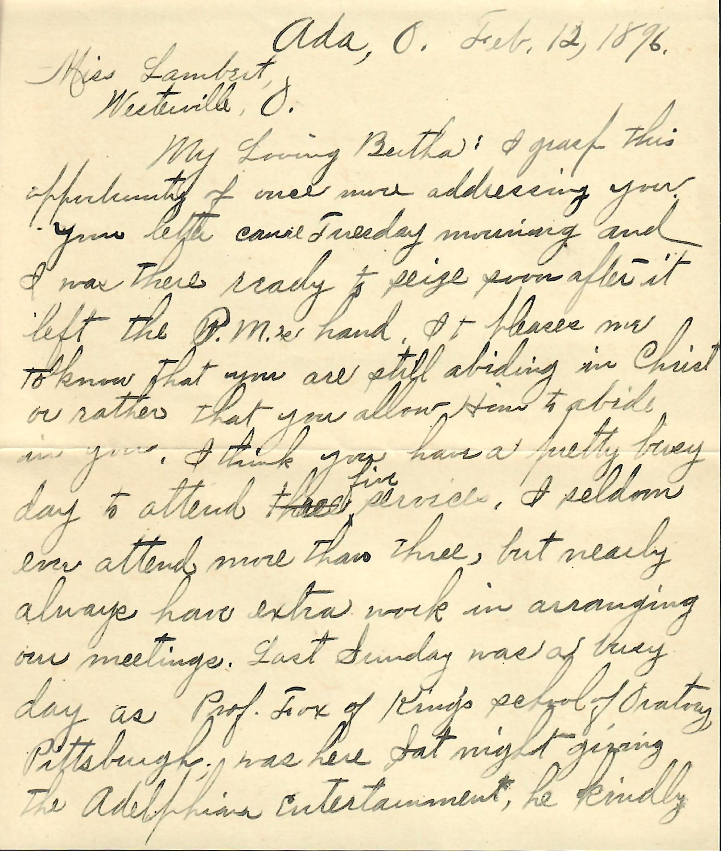 My Loving Bertha: I grasp this opportunity of once more addressing you. Your letter came Tuesday morning and I was there ready to seize soon after it left the P.M.'s hand. It pleases me to know that you are still abiding in Christ or rather that you allow Him to abide in you. I think you have a pretty busy day to attend five services. I seldom ever attend more than three, but nearly always have extra work in arranging our meetings. Last Sunday was a busy day as Prof. Fox of King's school of Oratory, Pittsburgh, was here Sat night giving the Adelphian Entertainment, he kindly consented to give a bible reading and talk to the Y.M.C.A. So I made seven calls before eight o'clock, called on one lady, but was told that she was in bed.