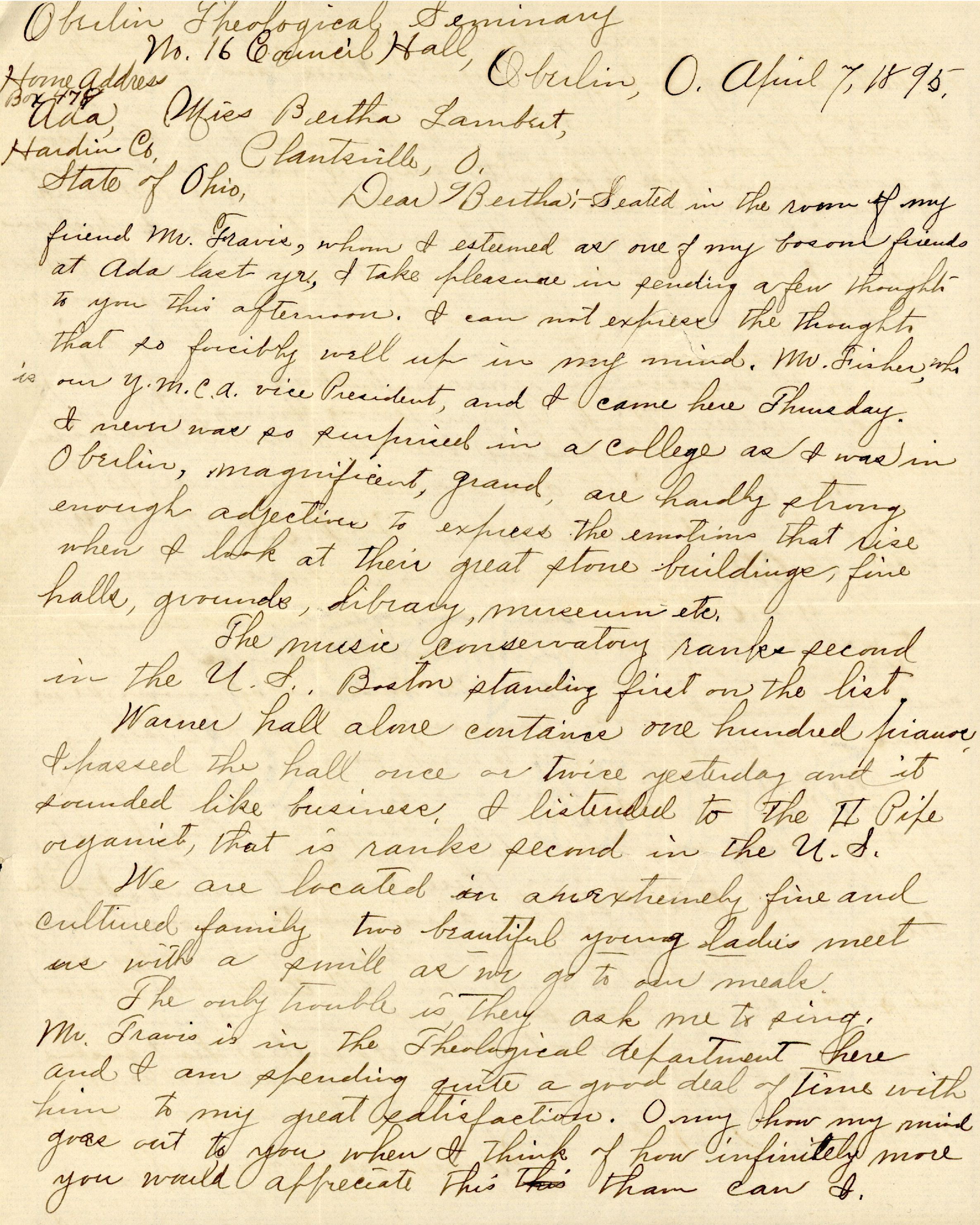 Dear Bertha: — Seated in the room of my friend Mr. Travis, whom I esteemed as one of my bosom friends at Ada last yr., I take pleasure in sending a few thoughts to you this afternoon. I can not express the thoughts that so forcibly well up in my mind. Mr. Fisher, who is our Y.M.C.A. vice President, and I came here Thursday. I never was so surprised in a college as I was in Oberlin, magnificent, grand, are hardly strong enough adjectives to express the emotions that rise when I look at their great stone buildings, fine halls, grounds, library, museums etc.