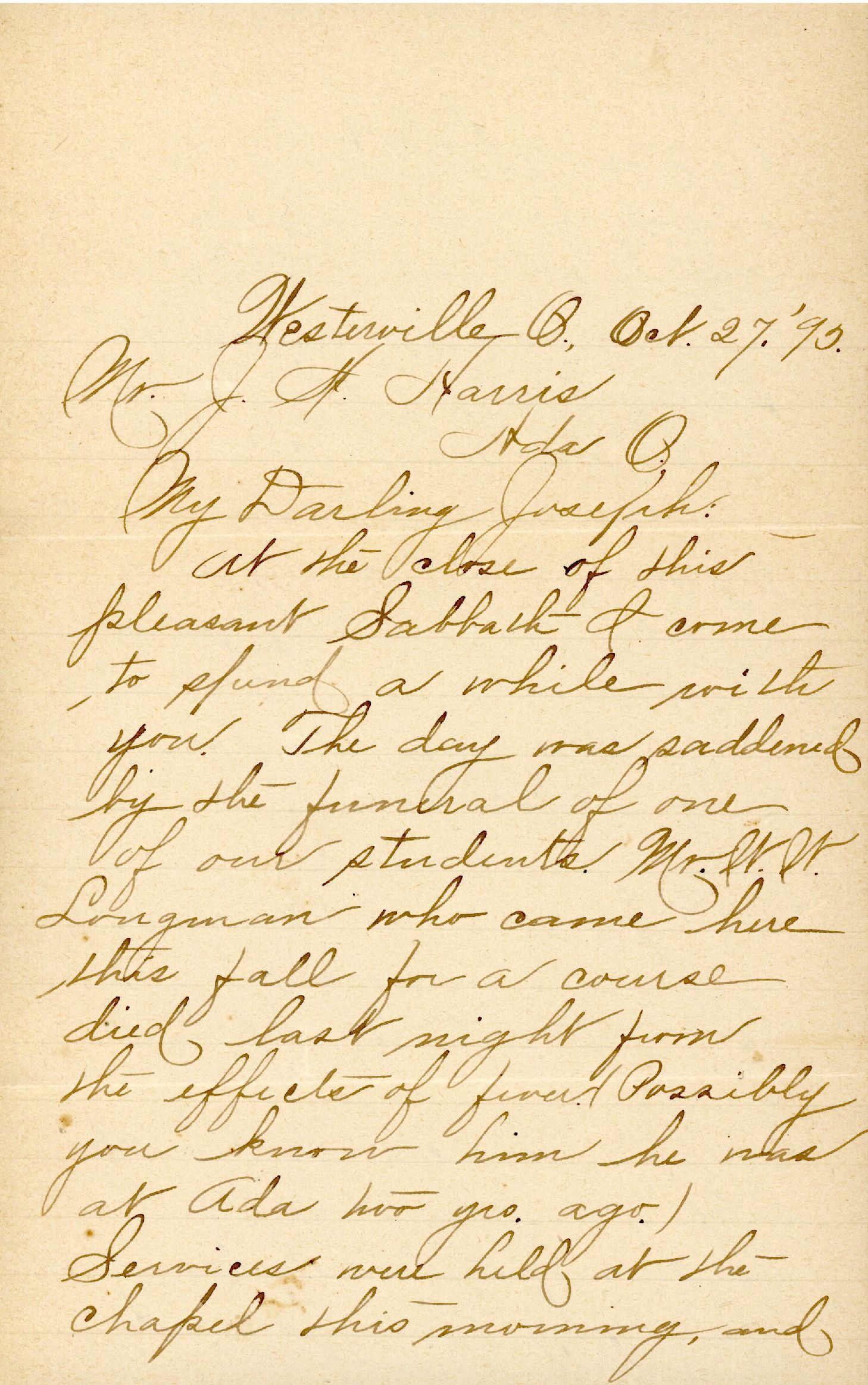 At the close of this pleasant Sabbath I come to spend a while with you. The day was saddened by the funeral of one of our students. Mr. W. W. Longman who came here this fall for a course died last night from the effects of fever. (Possibly you know him he was at Ada two yrs. ago.) Services were held at the chapel this morning, and he was then taken to his home at Germantown. His brother & betrothed, and his mother were the only friends. Although he had not joined society his brother's society furnished flowers and sent a delegate to accompany the friends to his home. Thus “In the midst of life we are in death.”