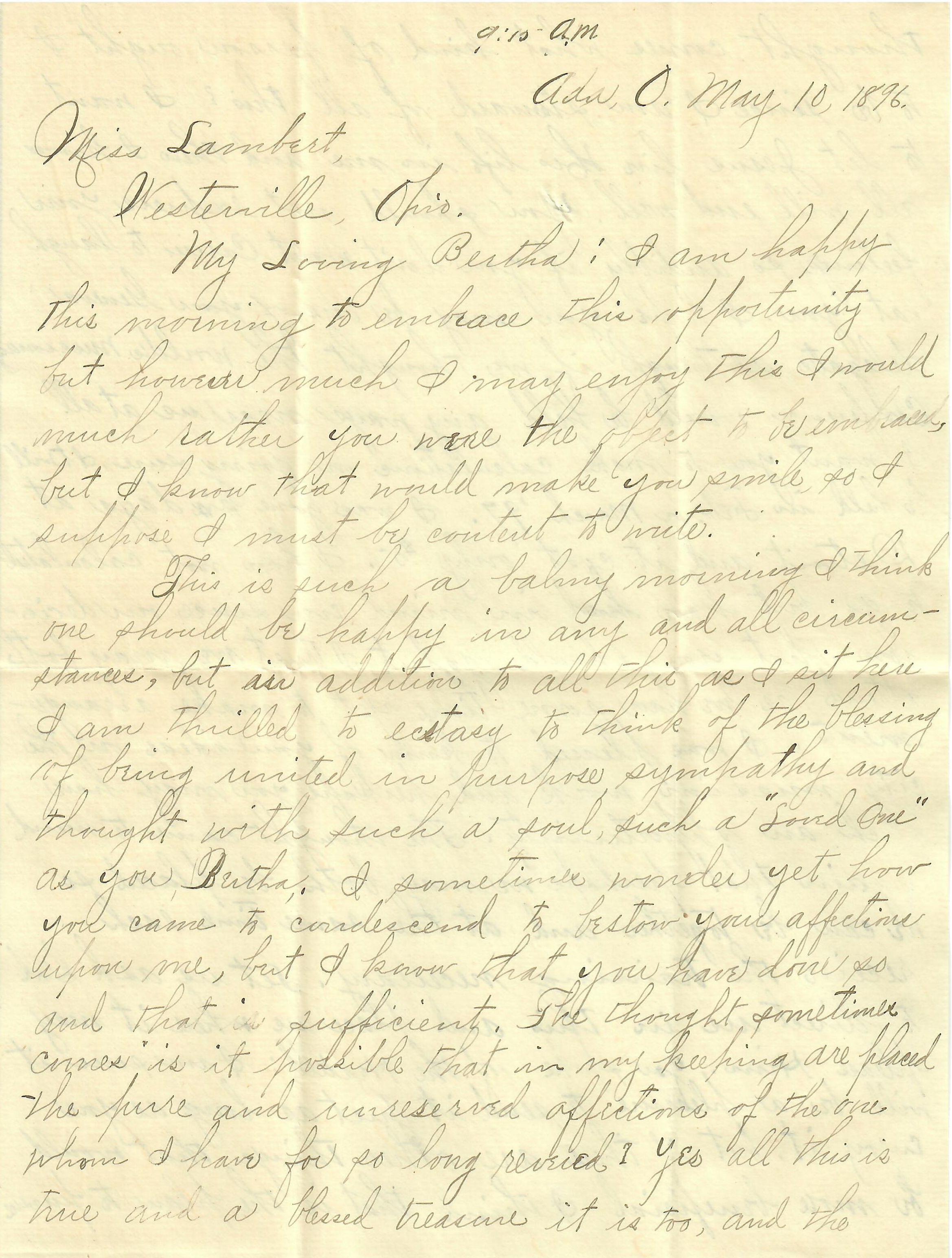 [Ada, OH, to Miss Bertha Lambert, Westerville, Ohio, “Franklin Co.”]