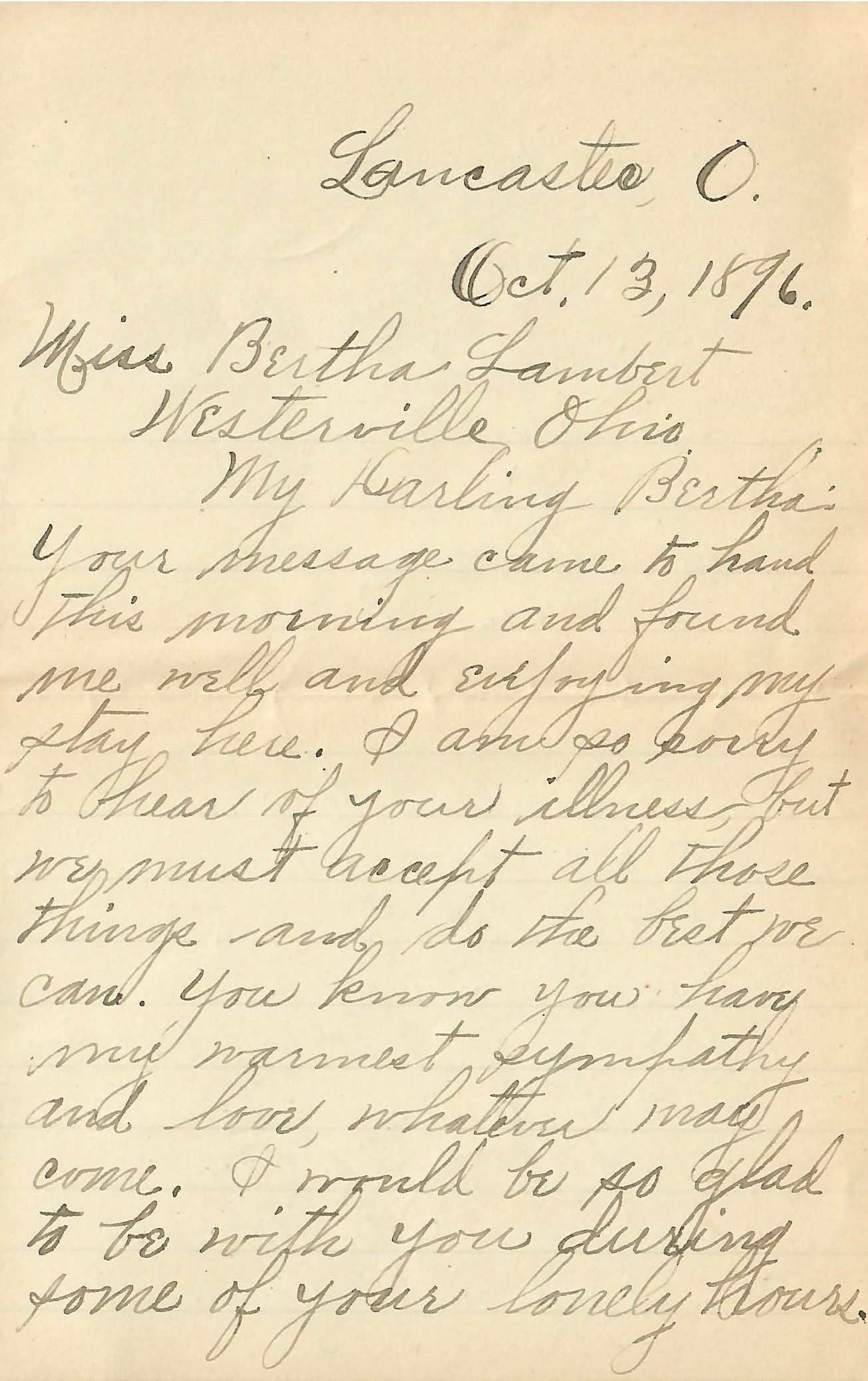 [Lancaster, OH, to Miss Bertha Lambert, Westerville, Ohio, “Franklin Co.”]