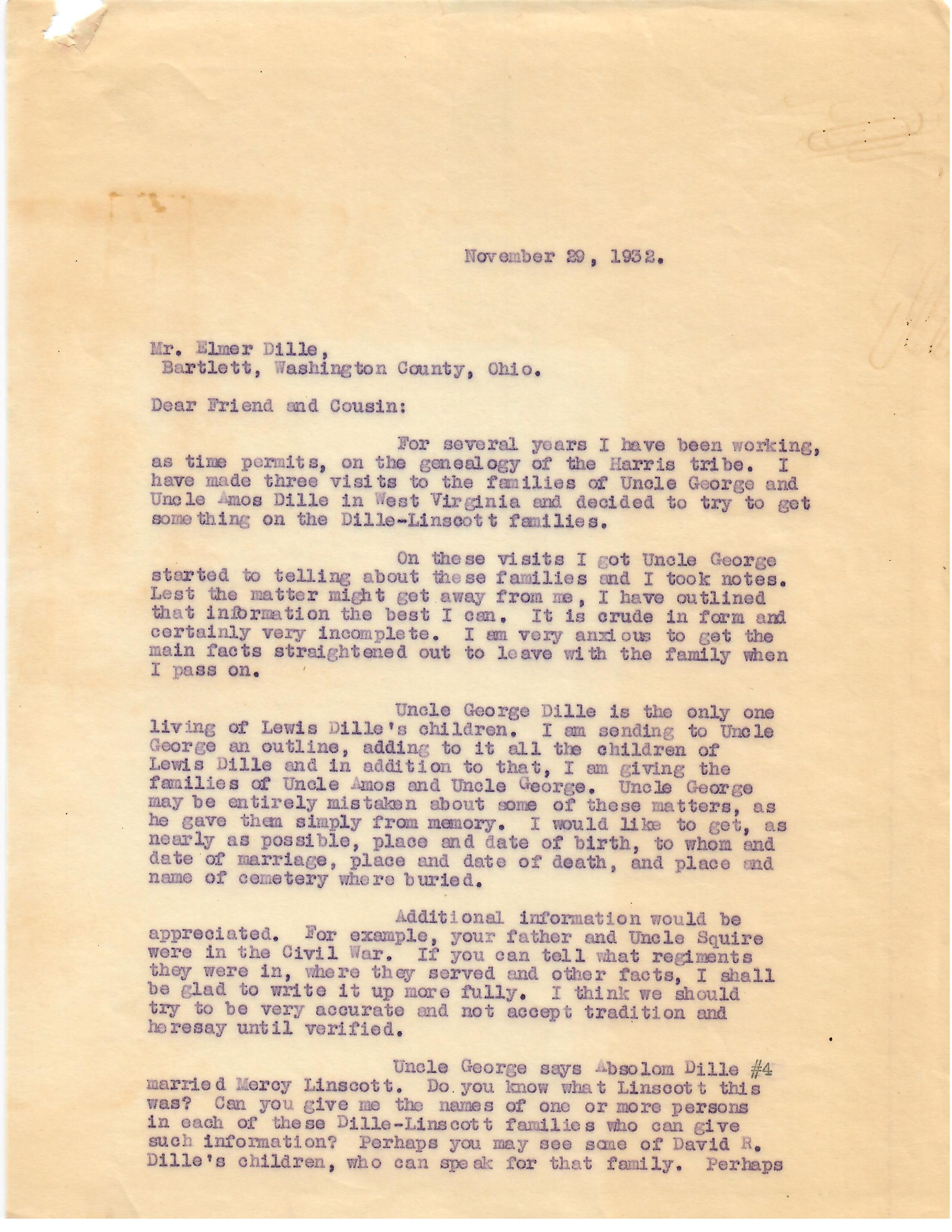 For several years I have been working, as time permits, on the genealogy of the Harris tribe. I have made three visits to the families of Uncle George and Uncle Amos Dille in West Virginia and decided to try to get something on the Dille-Linscott families.