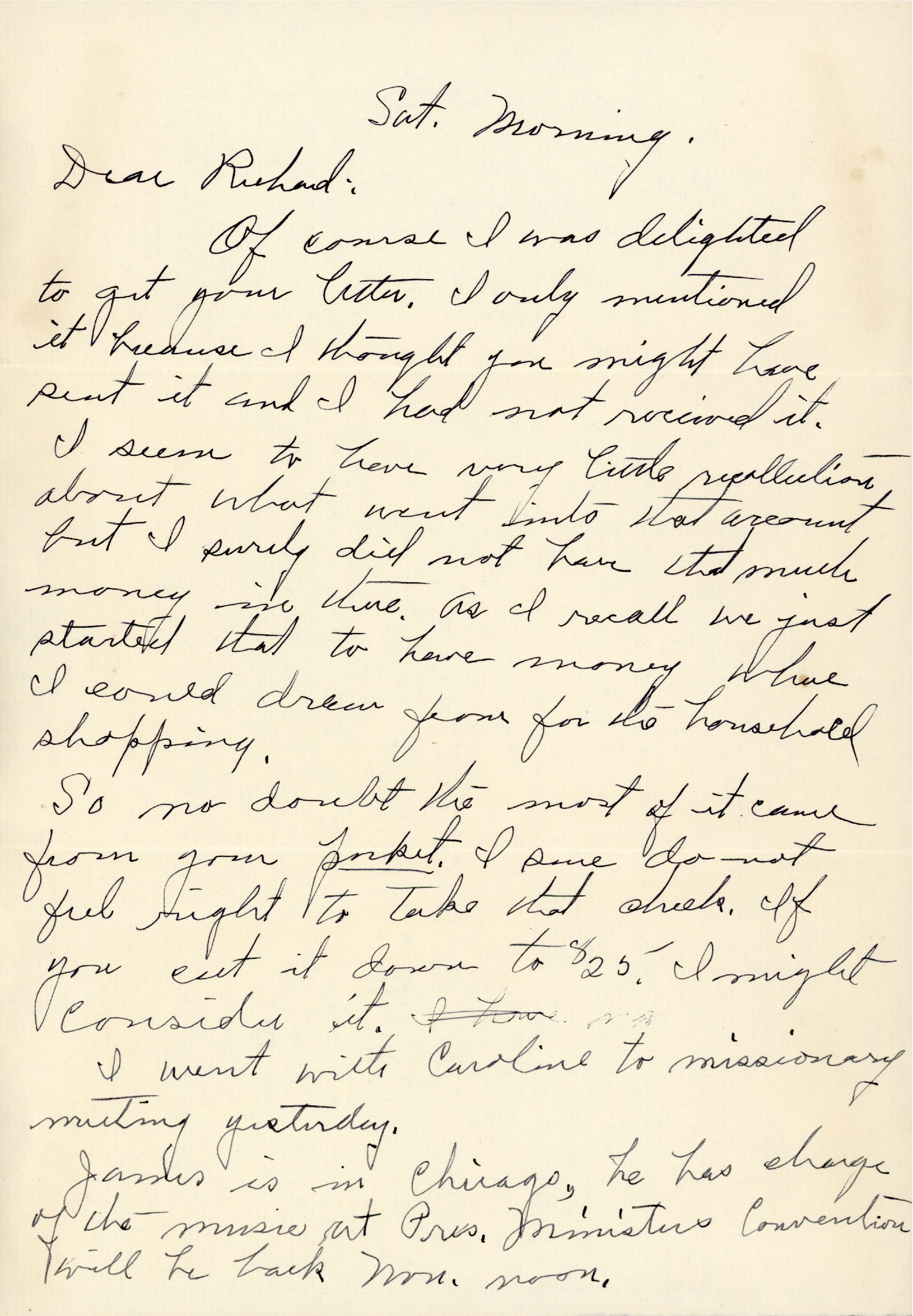 Of course I was delighted to get your letter. I only mentioned it because I thought you might have sent it and I had not received it. I seem to have very little recollection about what went into that account but I surely did not have that much money in there. As I recall we just started that to have money where I could draw from for the household shopping.