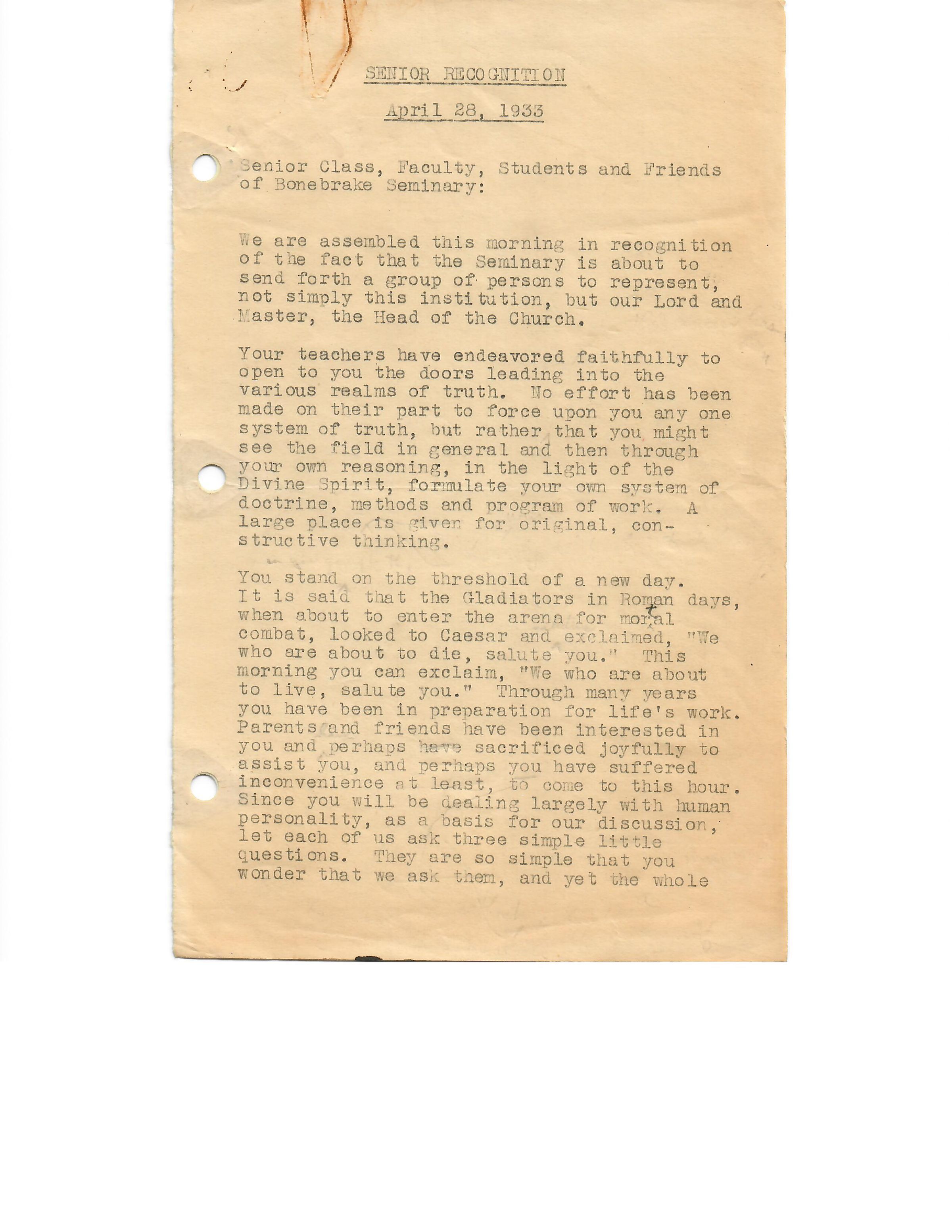 Senior Class, Faculty, Students and Friends of Bonebrake Seminary: