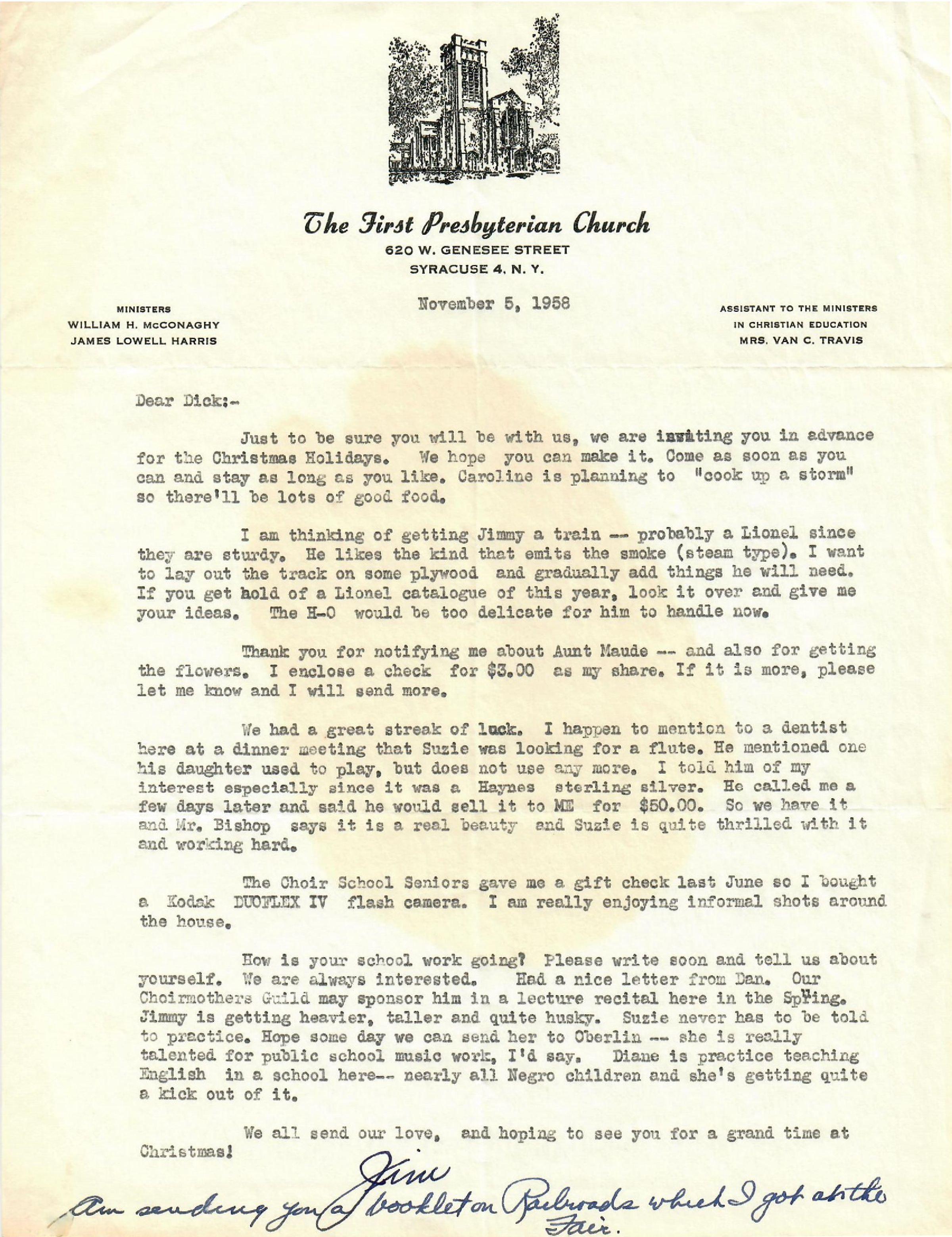 How is your school work going? Please write soon and tell us about yourself. We are always interested. Had a nice letter from Dan. Our Choirmothers Guild may sponsor him in a lecture recital here in the Spring. Jimmy is getting heavier, taller and quite husky. Suzie never has to be told to practice. Hope some day we can send her to Oberlin — she is really talented for public school music work, I'd say. Diane is practice teaching English in a school here-- nearly all Negro children and she's getting quite a kick out of it.