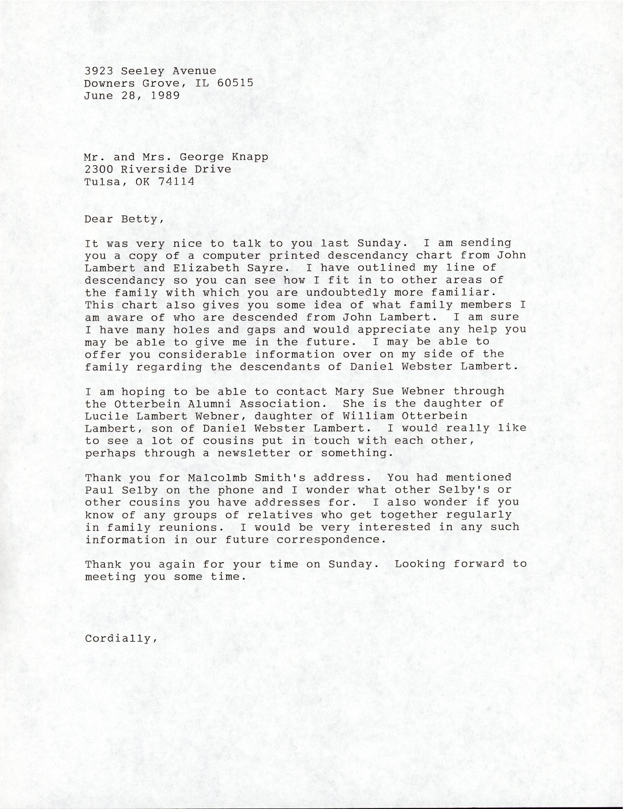 It was very nice to talk to you last Sunday. I am sending you a copy of a computer printed descendancy chart from John Lambert and Elizabeth Sayre. I have outlined my line of descendancy so you can see how I fit in to other areas of the family with which you are undoubtedly more familiar. This chart also gives you some idea of what family members I am aware of who are descended from John Lambert. I am sure I have many holes and gaps and would appreciate any help you may be able to give me in the future. I may be able to offer you considerable information over on my side of the family regarding the descendants of Daniel Webster Lambert.