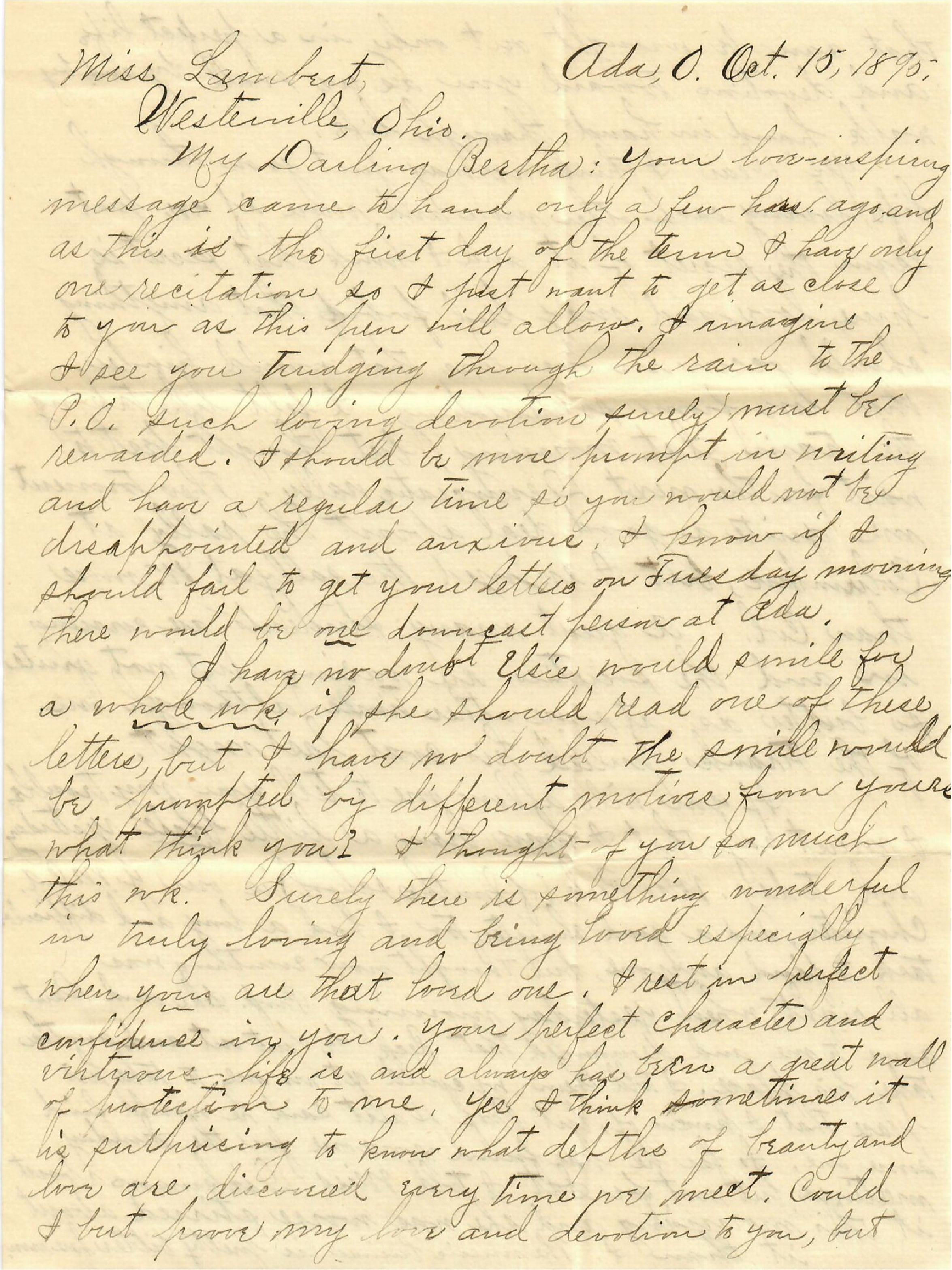 My Darling Bertha: Your love-inspiring message came to hand only a few hrs. ago and as this is the first day of the term I have only one recitation so I just want to get as close to you as this pen will allow. I imagine I see you trudging through the rain to the P.O. such loving devotion surely must be rewarded. I should be more prompt in writing and have a regular time so you would not be disappointed and anxious. I know if I should fail to get your letters on Tuesday morning there would be one downcast person at Ada.